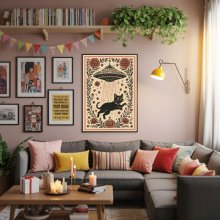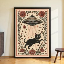 Digitales Poster UFO & schwarze Katze – Retro Space Katzenkunst – JPEG 300dpi