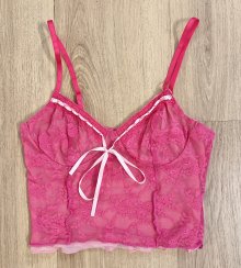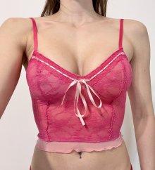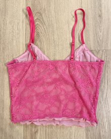 Sexy Damen Y2K halb durchsichtiges Mesh mehrlagiges Camisole Crop Top Pink Rosa Spitze Schnürung XS