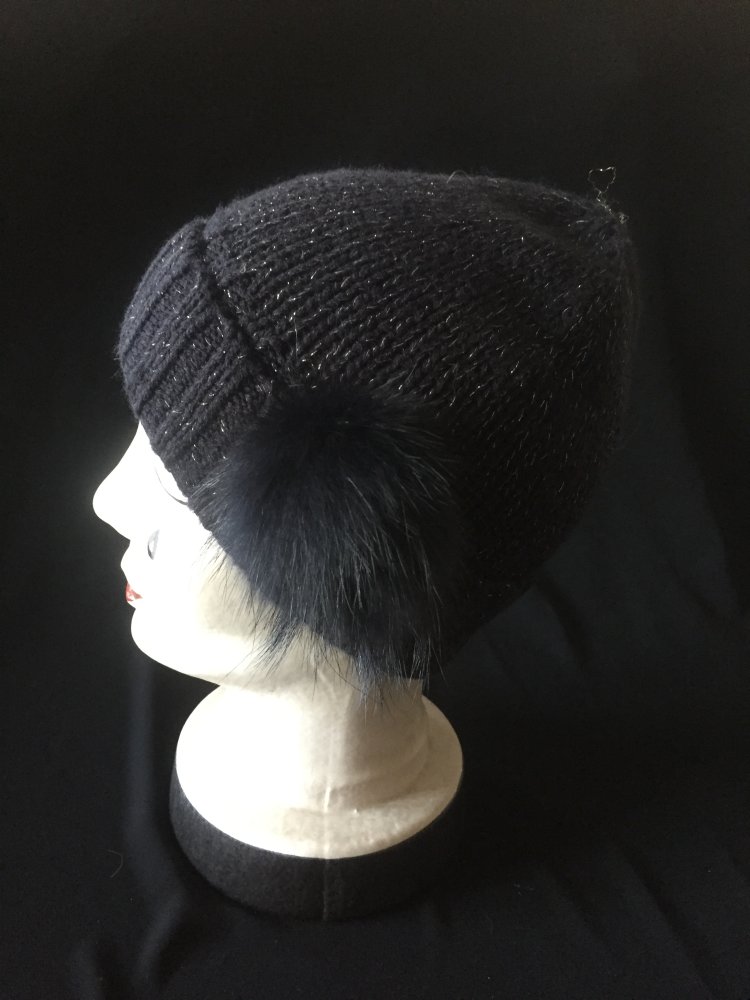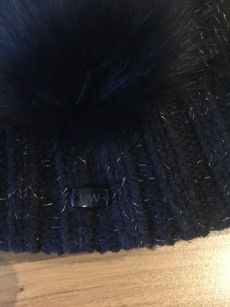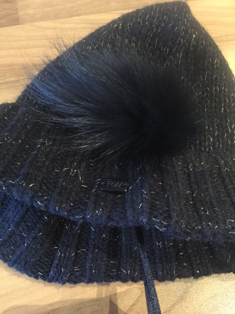 River WoodsRiver Woods Wollmütze mit verstellbarem Bommel Dunkelblau mit Silberfäden meliert, der Bommel ist mit Satinbändern seitlich angebracht, kann somit auch am Hinterkopf angebracht werden oder abgemacht werden