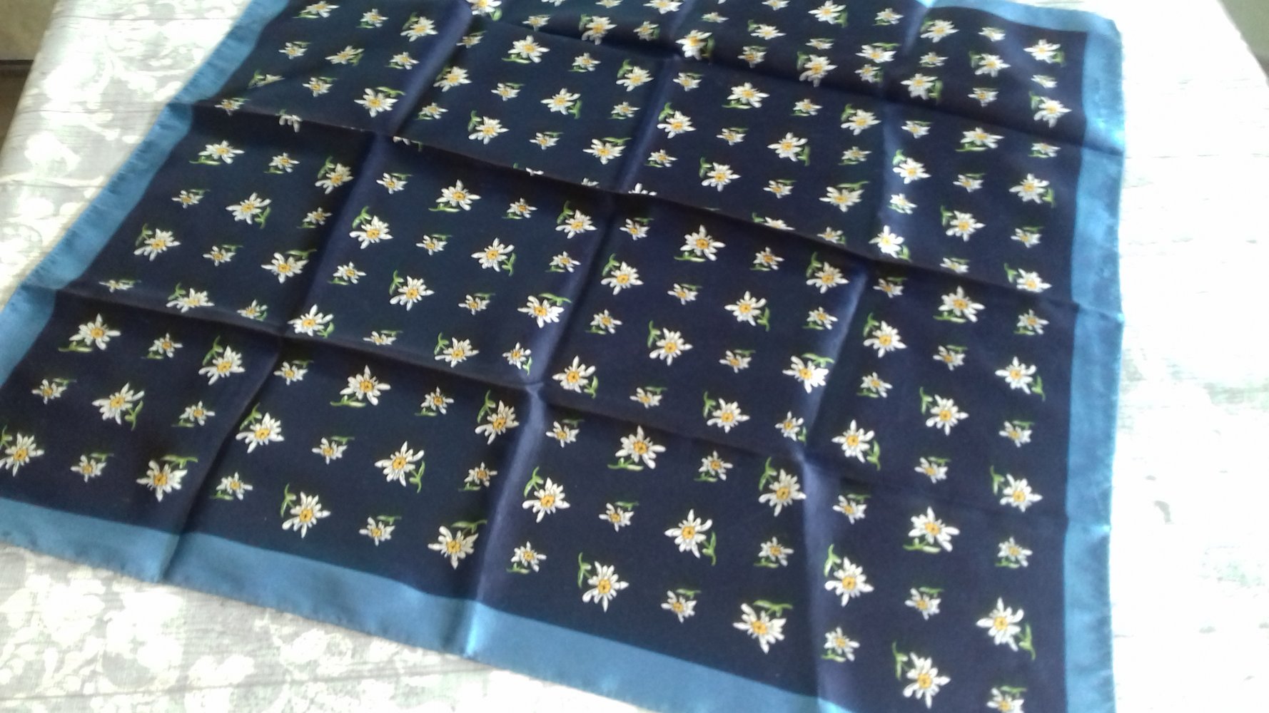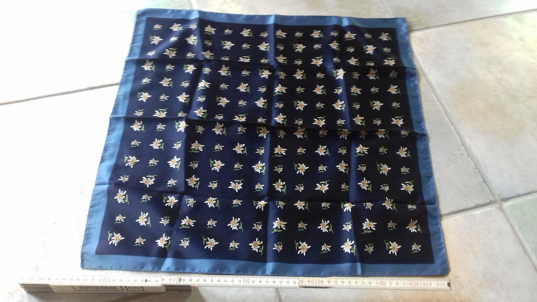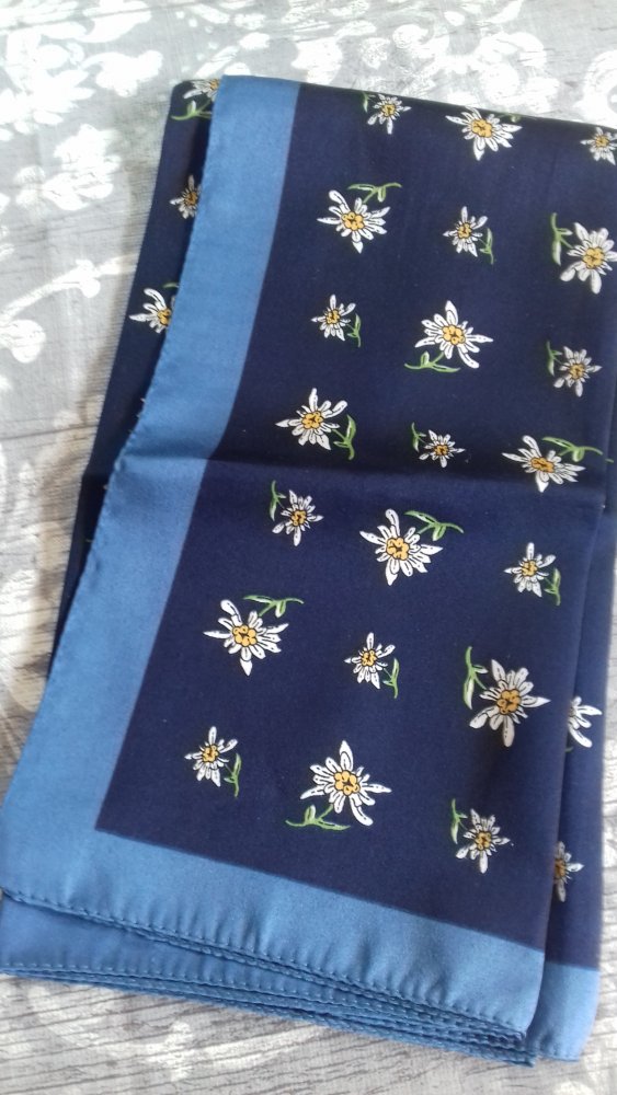 Tuch, Schal, Halstuch, Schaltuch, Foulard, Stirntuch, Haartuch in dunkelblauem Landhausstil. Trachten Muster Edelweiß. Alloverprint.