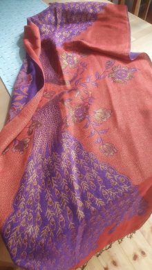 Schaltuch, orange- lila nit goldenem Muster und Fransen, 1.68 lang und 0.66 breit