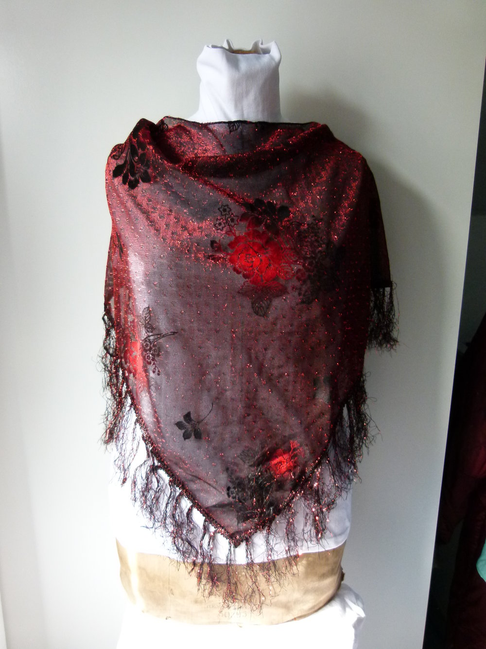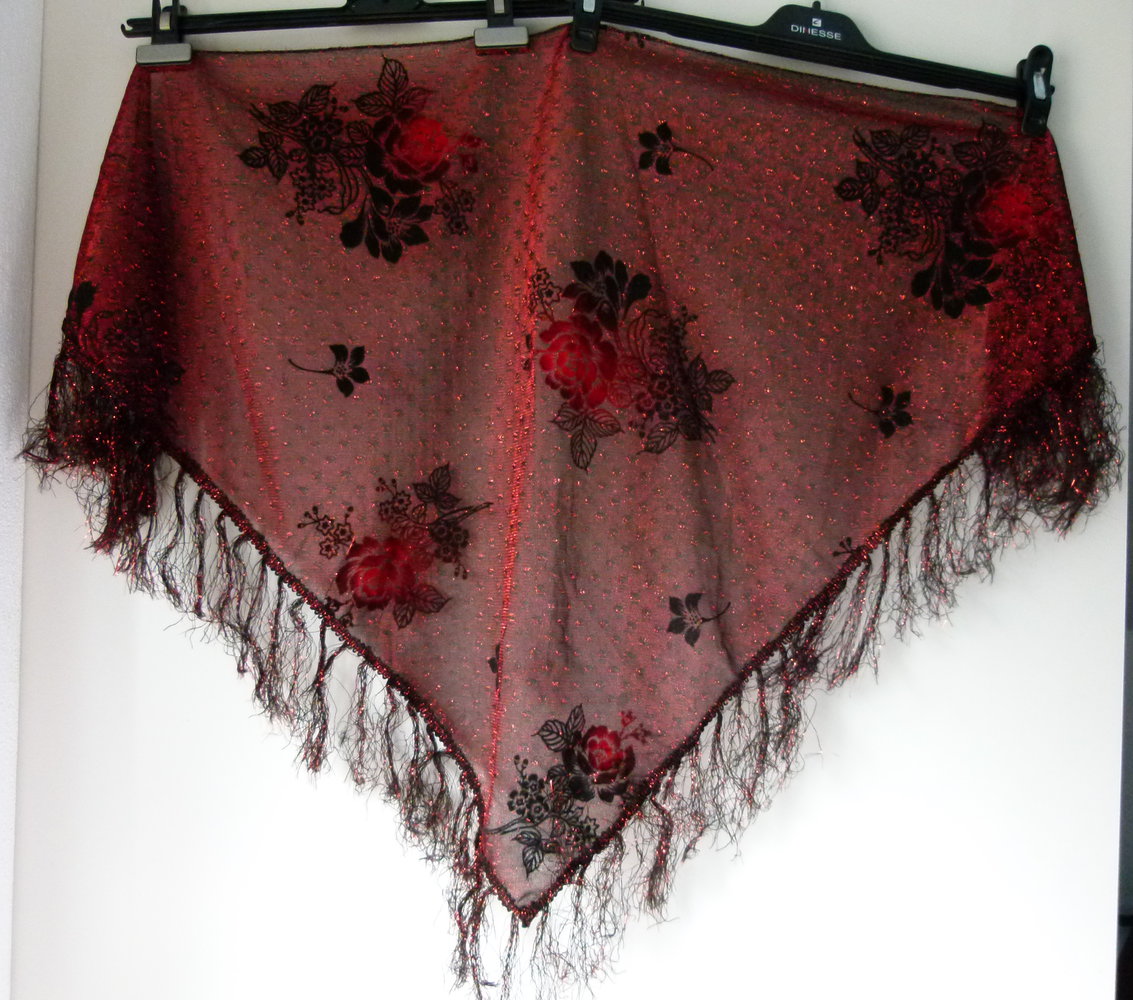 Wunderschönes Dreiecks-/Schulter-Tuch in schwarz/rot-glänzend mit Rosen-Motiv und langen Fransen.