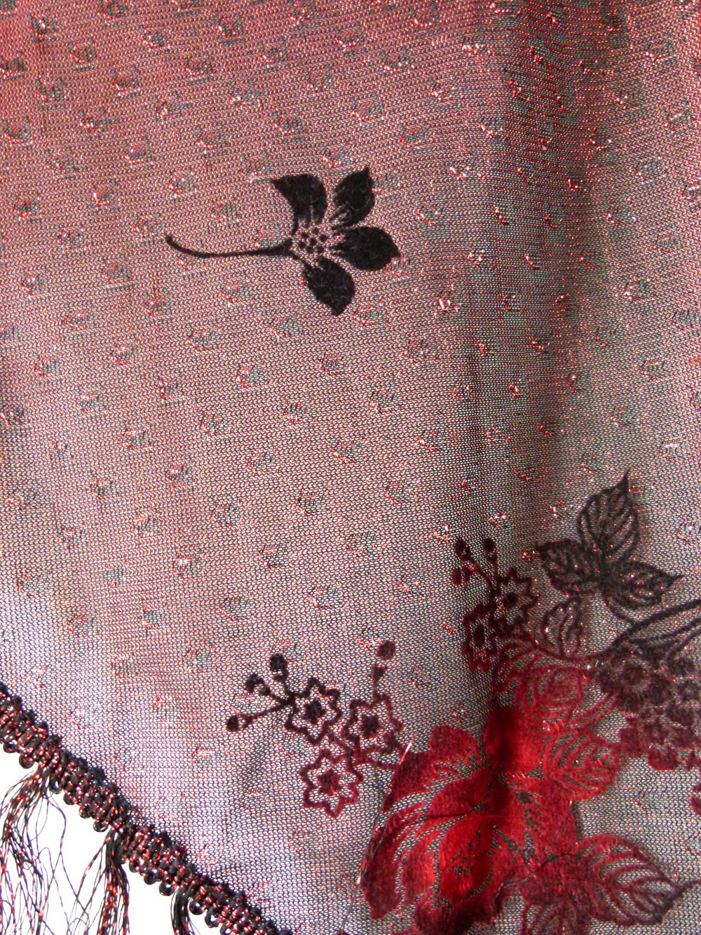Dreieckstuch Hüfttuch aus Japan, schwarz rot glänzend mit samtigem Rosen-Motiv, Mori Boho Gothic Festival Retro Vintage Velvet