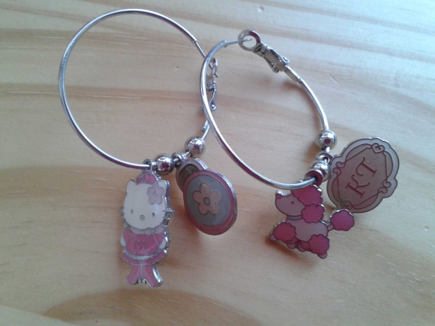 An einer hängt eine Hello Kitty und ein Kreis mit einer Blume, an der anderen ein Pudel und ein KT (sprich = Kitty). Das ganze ist in Pastelfarben gehalten. (pink, zartrosa, blau & creme).