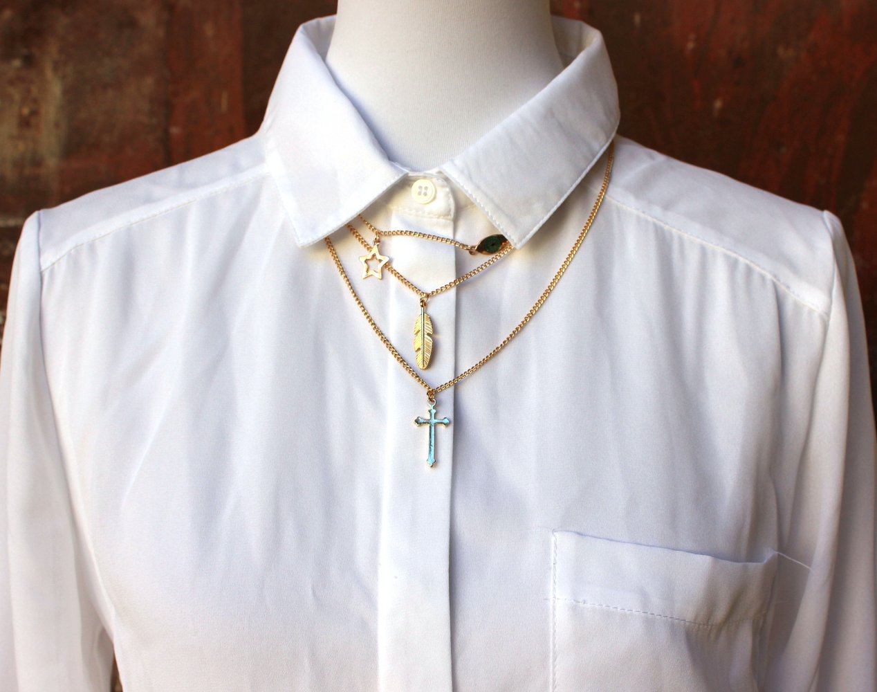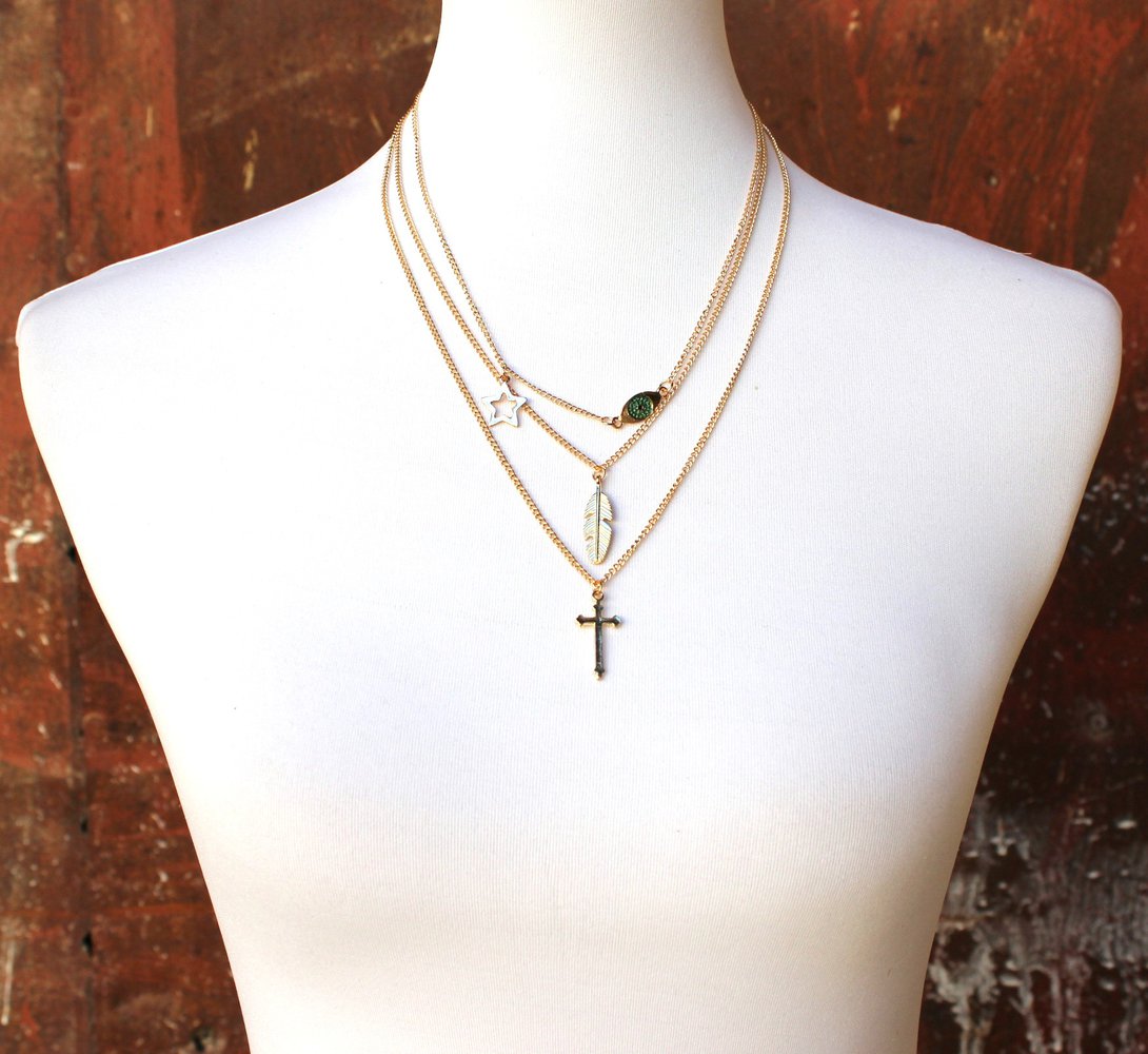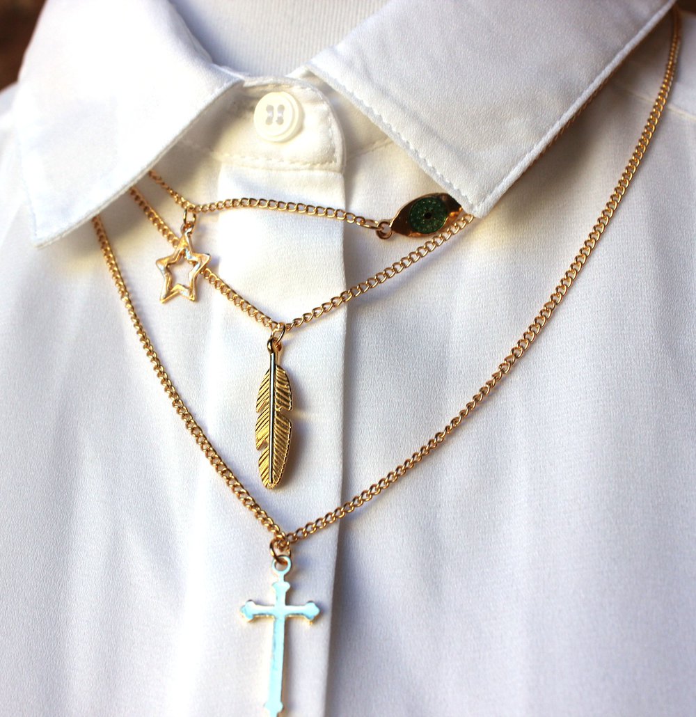 mehrreihige filigrane gelbgoldene Kette (Kreuz, Stern, Feder, Auge)