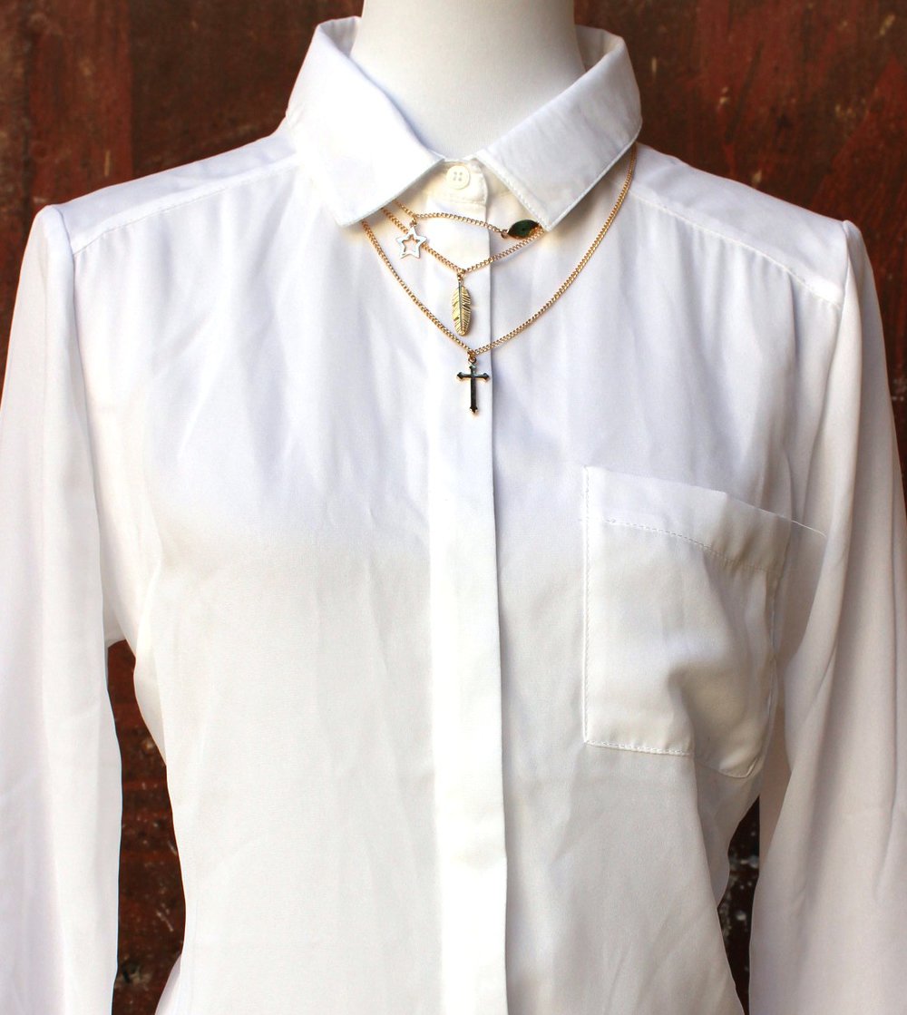 Die Bluse gibt's natürlich nicht dazu. Sie illustriert bloß wie die Kette getragen aussehen könnte.