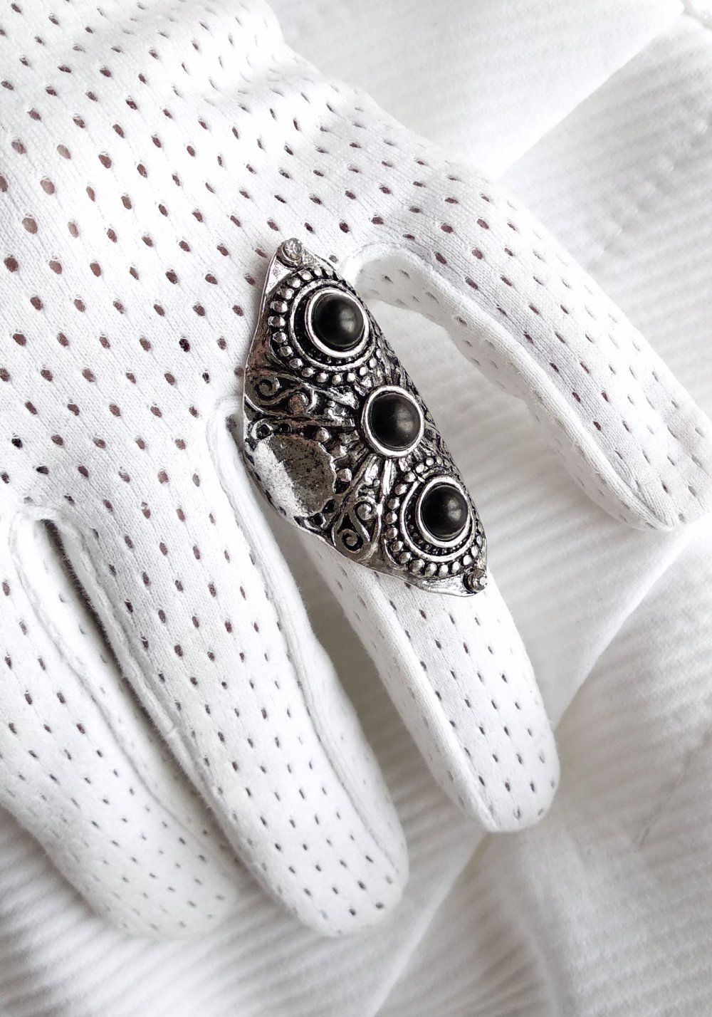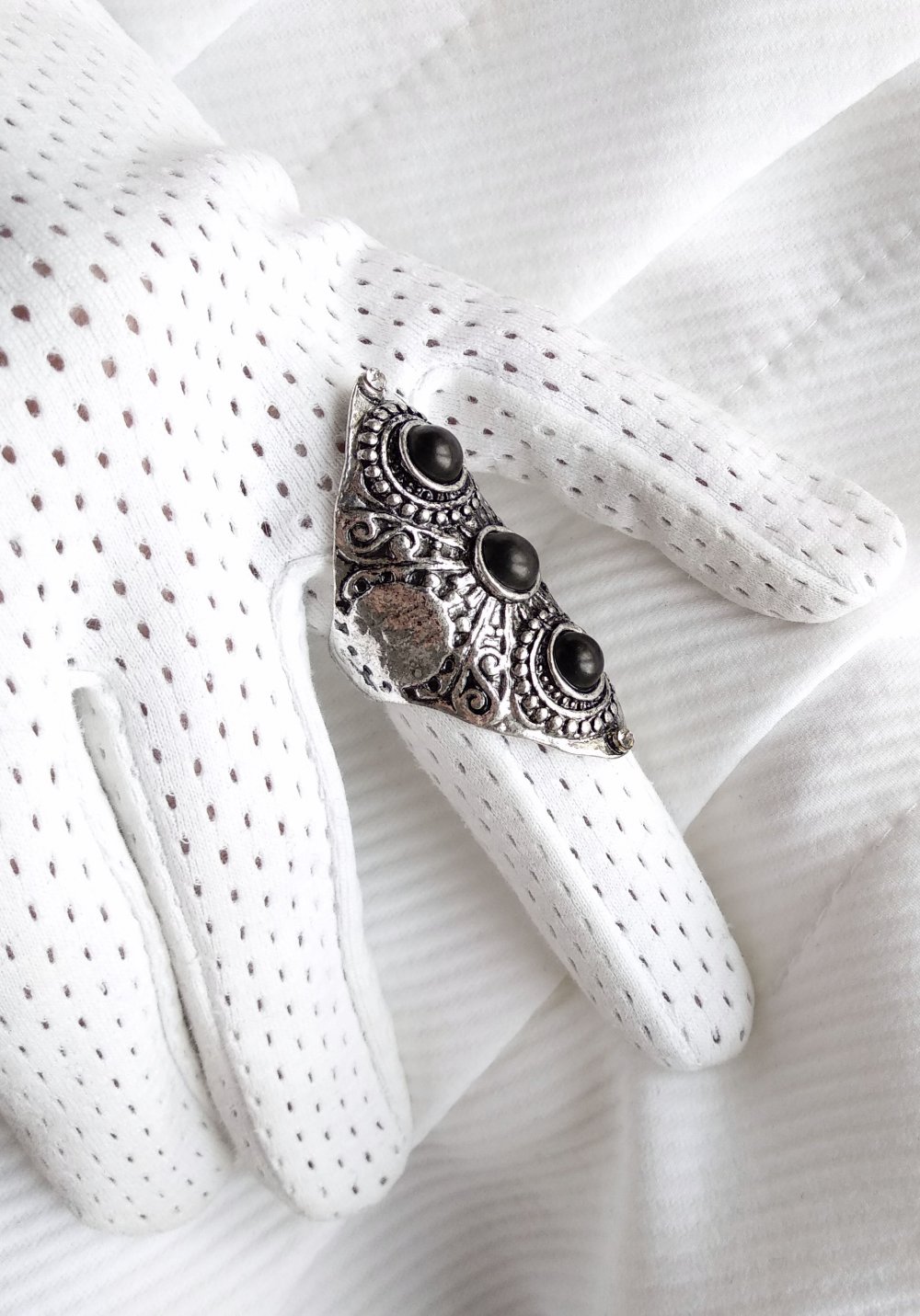 Eigenschaften: wunderschöner großer handgemachter Ring, eingraviertes Muster (mandalaartig/witchy Ornamente), 3 schwarze Steine und 2 kleine durchscheinend-weiße, läuft an beiden Enden spitz zu, bedeckt etwa ein ganzes Fingerglied