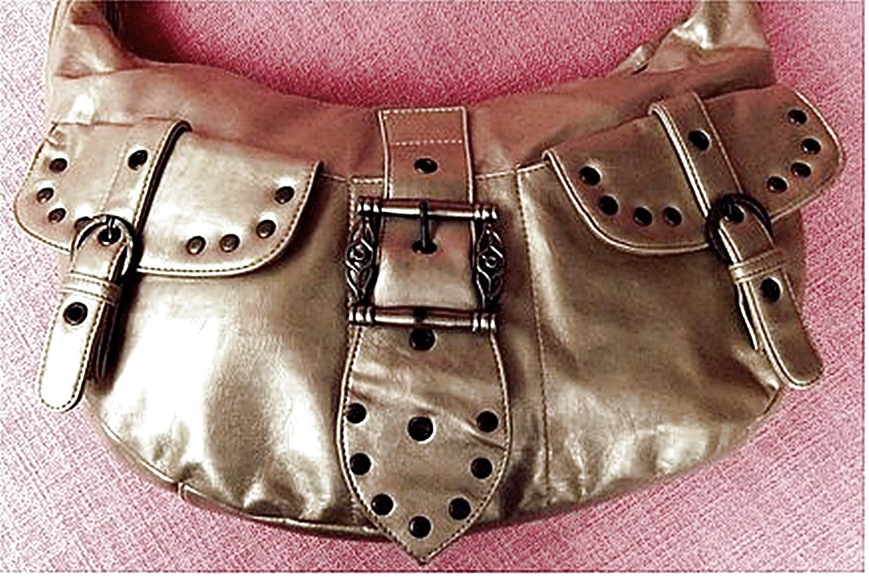 Damen-Handtasche hell goldfarbig - Mit vorderen Nieten- / Gurt-Applikationen - Aus Syntetik