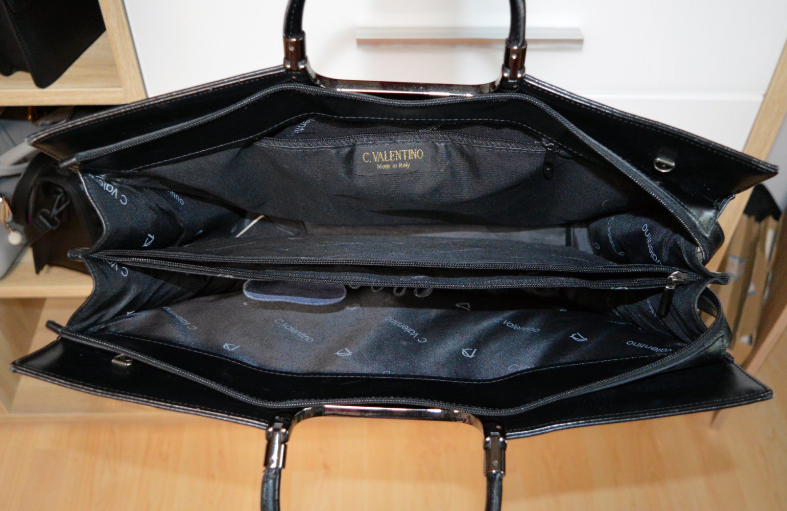 Made in Italy, schwarzes Leder, 2 Tragehenkel, 1 Umhängegurt, 1 Innentasche geteilt mit Lederhalterungen für Handy, 4 Schreibgeräte, 3 Bankkartenfächer, 2 Innentaschen mit Reißverschluss, Innen Stoff mit Valentino Logos, Maße: Breite: oben ca. 43 cm, unten ca. 33,5 cm, Höhe ca. 29 cm, Tiefe: oben ca.5 cm, Tiefe unten ca. 10 cm, auf der Unterseite 4 Metallfüße, neuwertig, 4 kleine Transportdruckstellen auf der Rückseite der Tasche, kaum sichtbar, wie Foto. Die Tasche ist ca. 19 Jahre alt, selten benutzt, keine Rechnung mehr vorhanden.