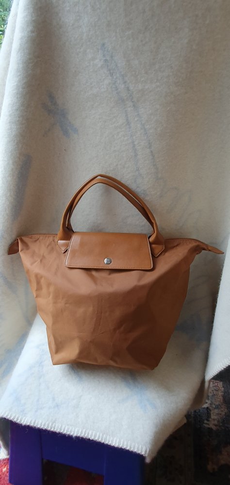 praktische, zusammenfaltbare Damenhandtasche, die Henkel und die Vorderlasche sind aus Leder, die übrige Tasche ist aus Nylon, ein kleines Innenfach, oben hat die Tasche noch einen langen Reißverschluss, Vorderlasche mit Druckknopf, beim Zusammenklappen wird die Vorderlasche an einem zweiten Druckknopf befestigt, Tasche wird trapezartig nach oben hin breiter, Breite unten 22 cm, Tiefe ca. 16 cm, Höhe 30 cm, zusammengeklappt 16 cm. Hervorragender Gesamtzustand.
