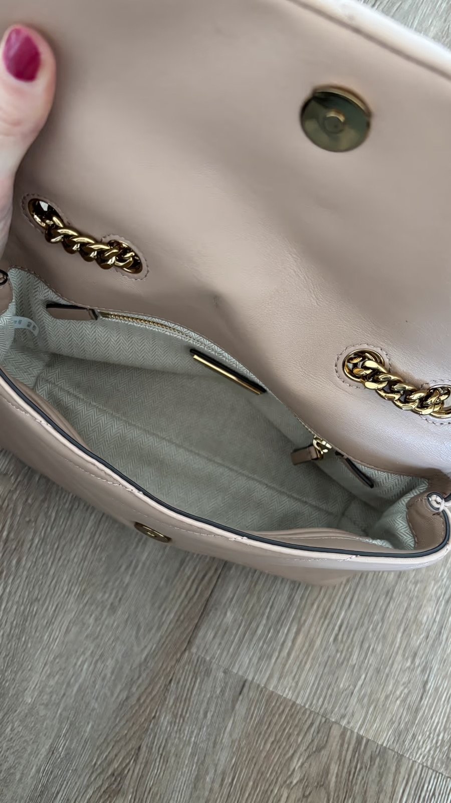 Da ich meine Handtaschen-Sammlung auflöse, trenne ich mich von meiner Kira Chevron Small in der schönen Farbe „Devon Sand" von Tory Burch. Inkl. Staubbeutel.