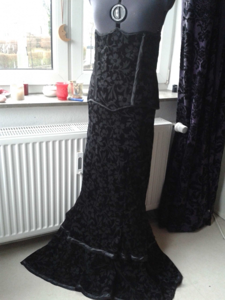 Das Outfit besteht aus einem tollen schwarzen Fishtail aus Ausbrennersamt, schön eng um die Hüften und ab dem Knie in zwei Stufen weitfallend. Unterlegt ist der Rock mit einem Unterrock und Tüll, so dass der Rock schön fällt. Der Rock hat keinen Verschluss und muss über Kopf angezogen werden, das Material ist jedoch stretchig, das sollte kein Problem sein. Verziert ist er mit zarter Spitze und Satinbändern, wunderbar elegant.