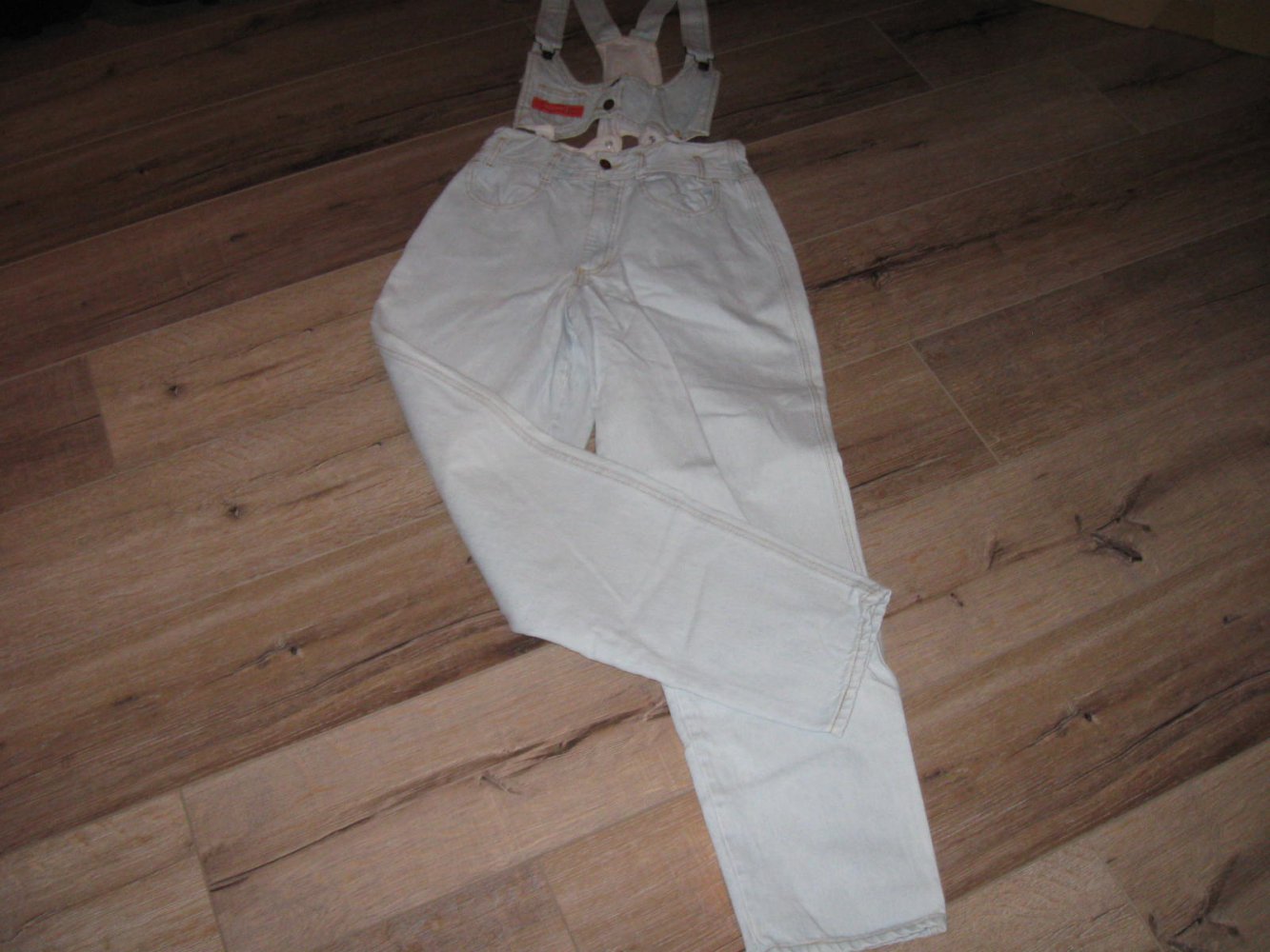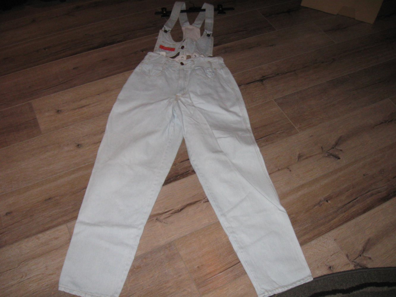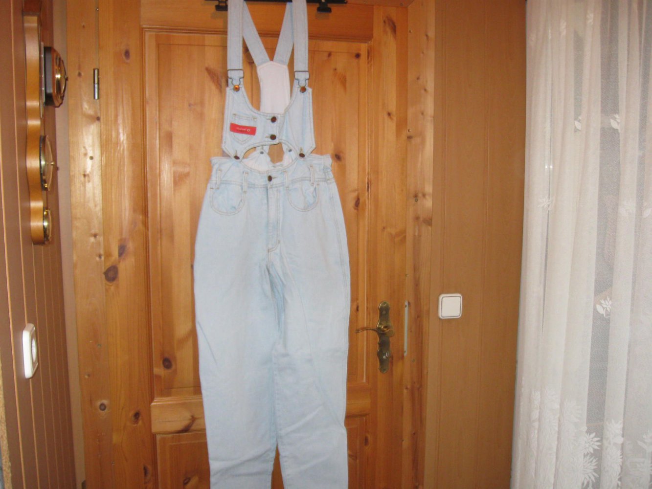 Biete diese absolute Rarität von einer Latzjeans. Der Latz ist abnehmbar, der Schnitt, damals nannte man das den sogenannten Karottenschnitt, d.h. an den Schenkeln weiter, zum Bein Ende enger geschnitten. Hinten am Bund ist sie etwas gerafft. Wer diese Zeit kennt, wird diese Hose lieben. Ich habe die Größe geschätzt. Hier einige Maßangaben: