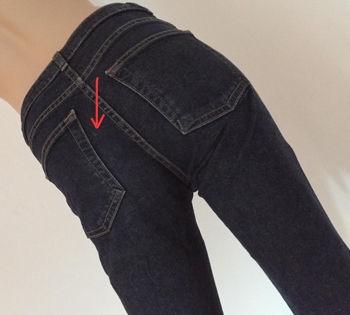 Am Po, neben der linken Tasche, gibt es einen kleinen Webfehler im Stoff, aus dem ein Loch werden könnte (siehe Markierung).