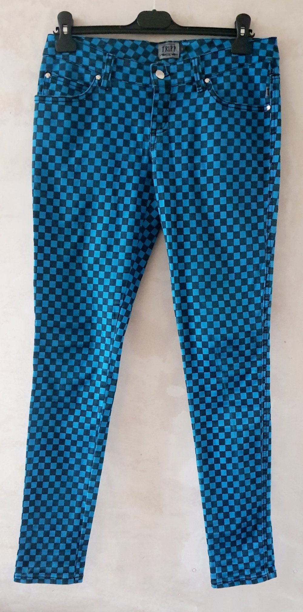 In super condition.low rise Cotton & Spandex stretchy trousers .With 5 x pockets .Skull studs on pocket corners .Cross banding detail on centre back belt loops .Zip and button fastening .