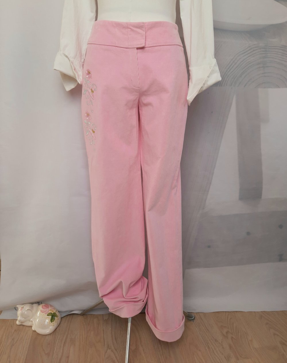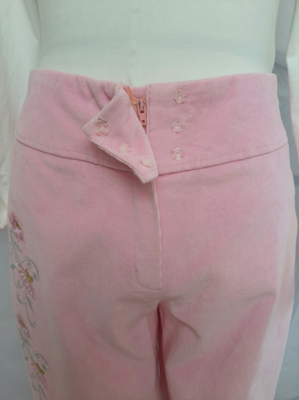 Diese Hose ist wirklich ausgefallen! Feiner Cord in einer tollen Farbe! Ich habe die Hose immer mit sehr hohen Stiefeletten in passender Farbe getragen. Deshalb auch das sehr lange Hosenbein von einer Länge von ca. 108,5 cm (ohne Bund 101,5 cm) inklusive dem Bund von 7 cm. Somit vielleicht auch gut tragbar für jemand der über 1,70m Körpergröße liegt. Bundweite bei ca. 82 cm. Damit keine Knöpfe stören, hat die Hose nur drei kleiner Druckköpfe zum schließen. Hose wurde nur selten getragen.