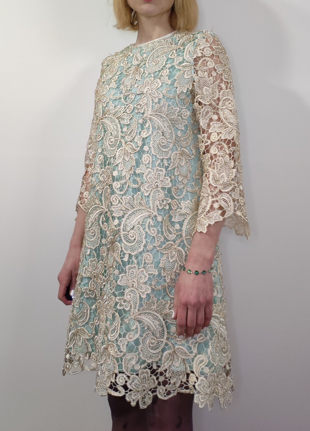 Wunderschönes, elegantes Spitzenkleid in Türkis/Mint mit luxuriöser Goldstickerei