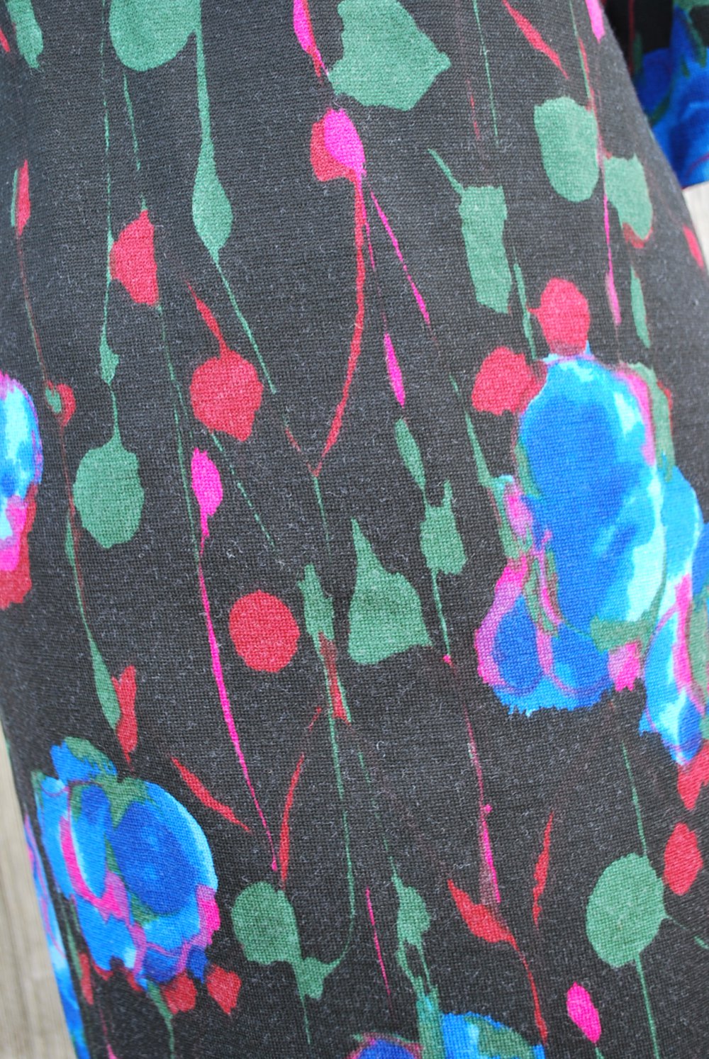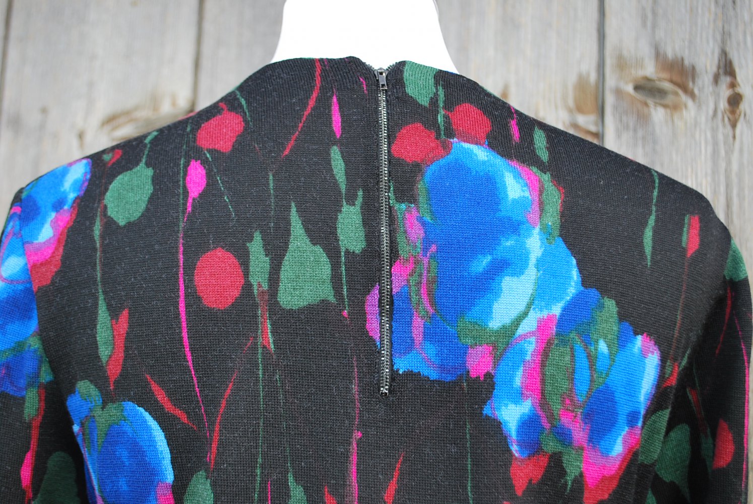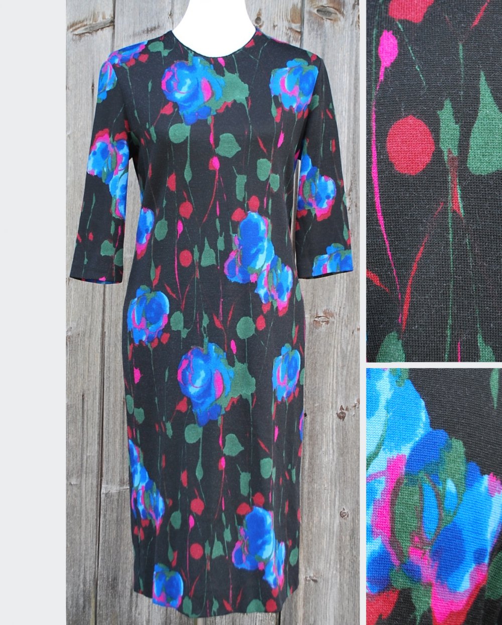 True Vintage, Vintagekleid, Wollkleid, Winterkleid, Blumenmuster, abstraktes Muster, schwarz, bunt. Luisa Spagnoli, italienische Mode, anliegend, elegant, Bodycon, hochgeschlossen