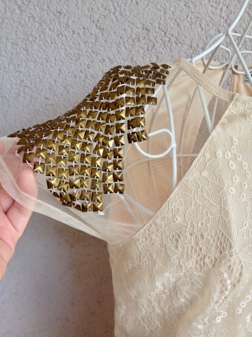 Ein sehr schönes Spitzenkleid von Pull & Bear. Es sitzt super schön und hat ein sehr romantisches Spitzenmuster. An den Schultern hat es zwei transparente Stellen, die mit tollen goldenen Nieten verziert sind. Hinten wir das Kleid mit einem kleinen Haken geschlossen, wodurch ein kleiner ovaler Rückenausschnitt entsteht.