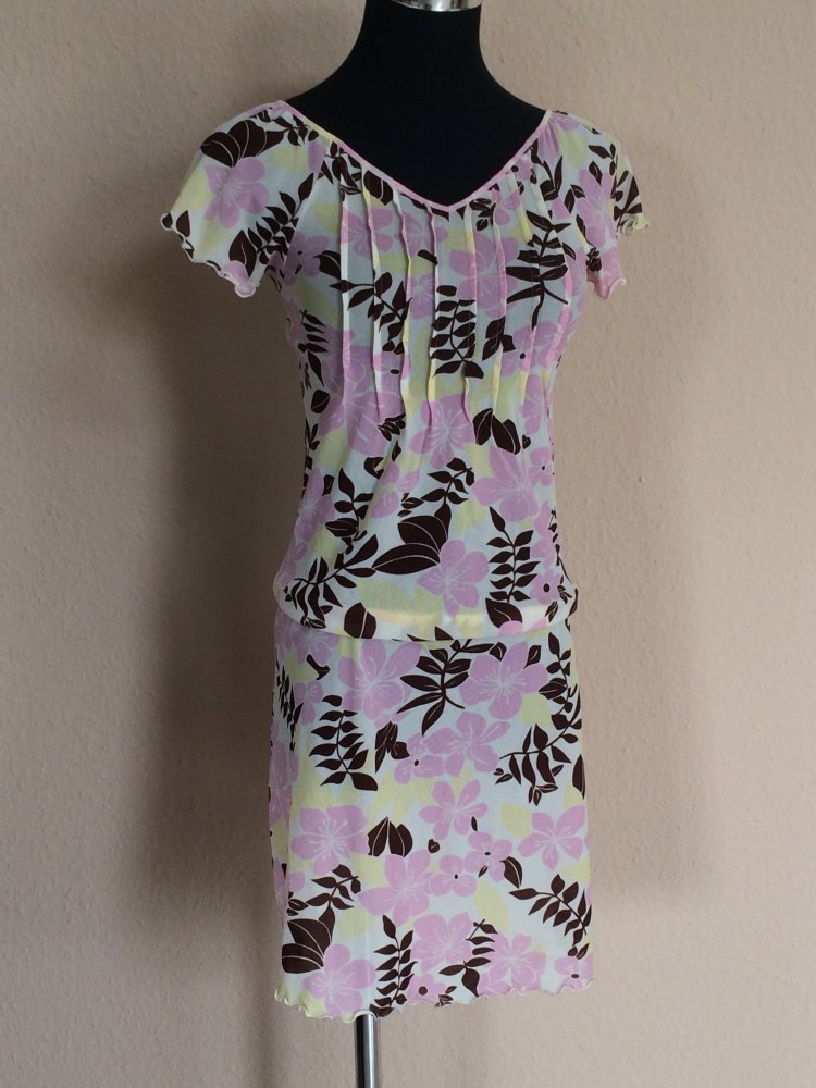 Süßes leicht transparentes Minikleid mit Dschungel Print in Rose, beige, braun Pastell Puder Tönen, mit Biesen über der Brust und Carmendekolte leicht fließender Stretchstoff, Kleid ist mit einer Gr. S ausgezeichnet kann aber auch gut als XS getragen werden, das Material wirkt transparent ist aber nicht durchsichtig