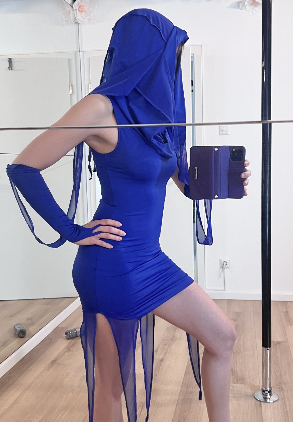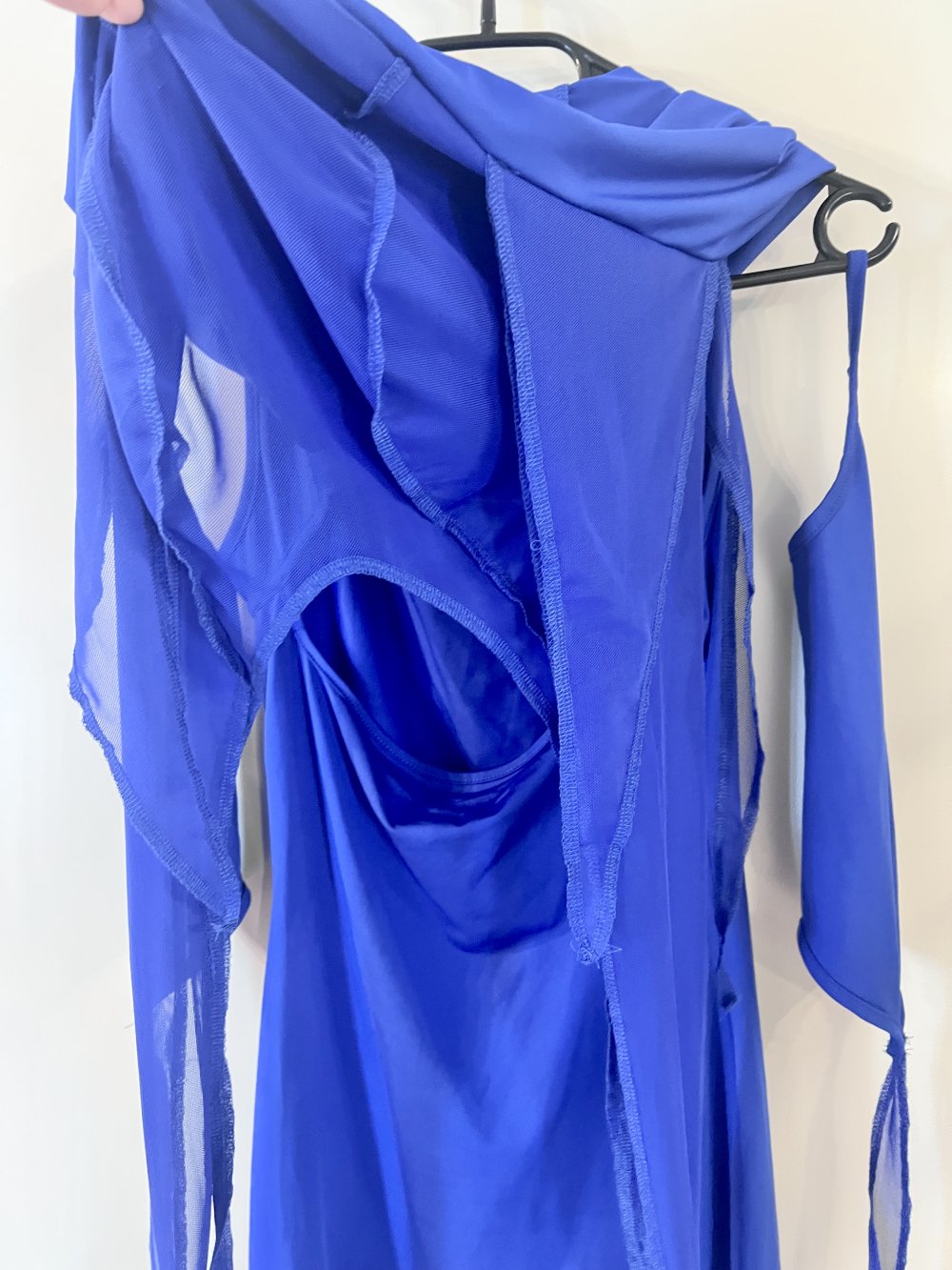 Sehr schönes Bodycon Minikleid in königsblau mit Handschuhen und allerlei Zipfeln, passt XS-S, etwas stretchig.