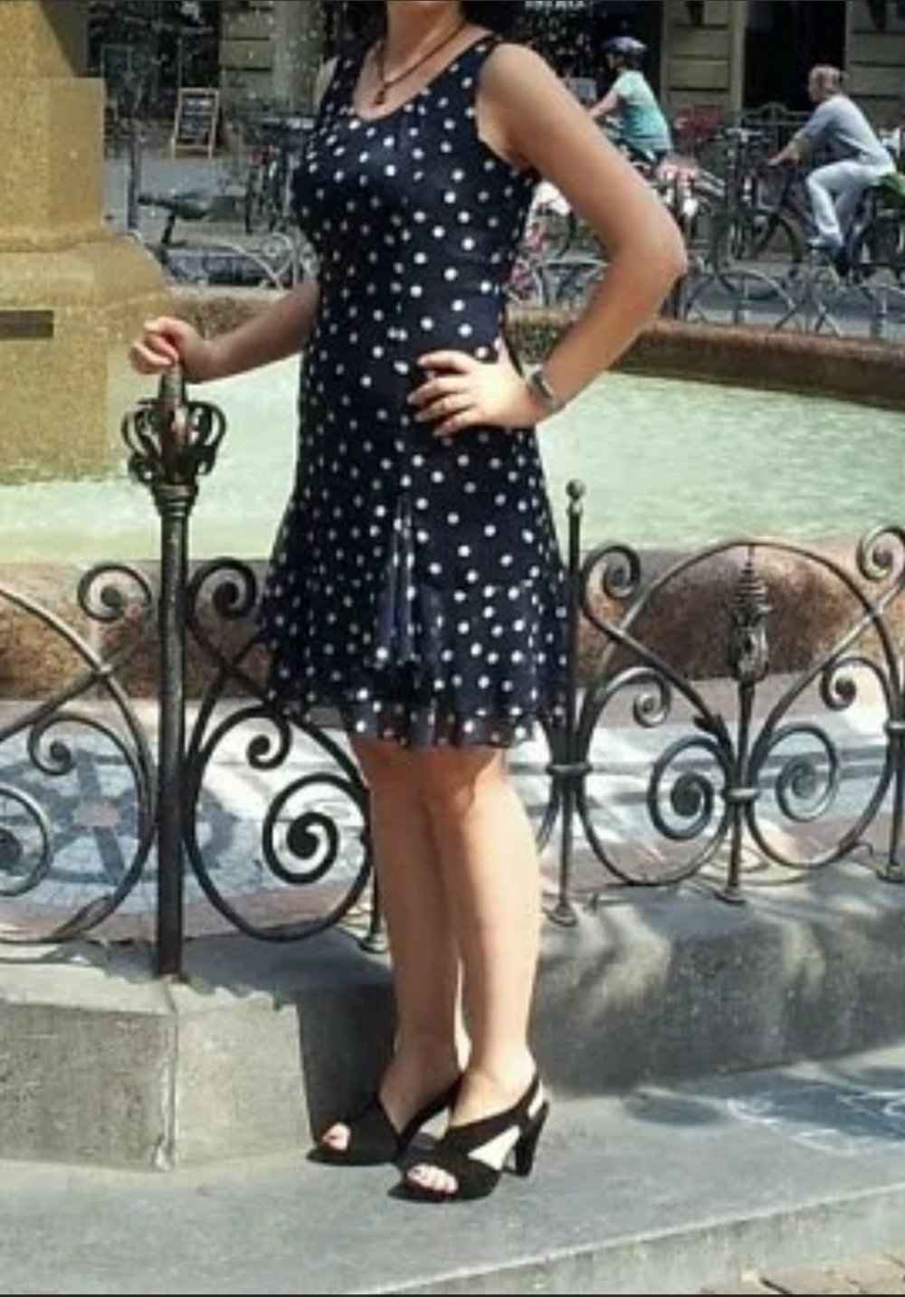 Dunkelblaues Kleid, weiß gepunktet, sehr figurbetont, sieht sehr elegant und romantisch aus.