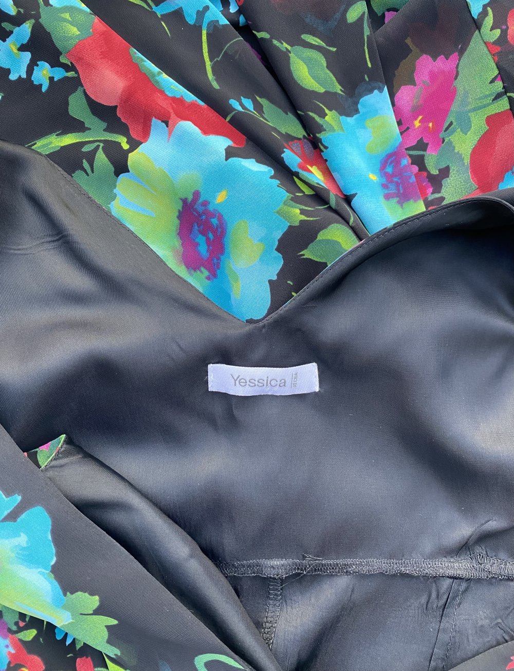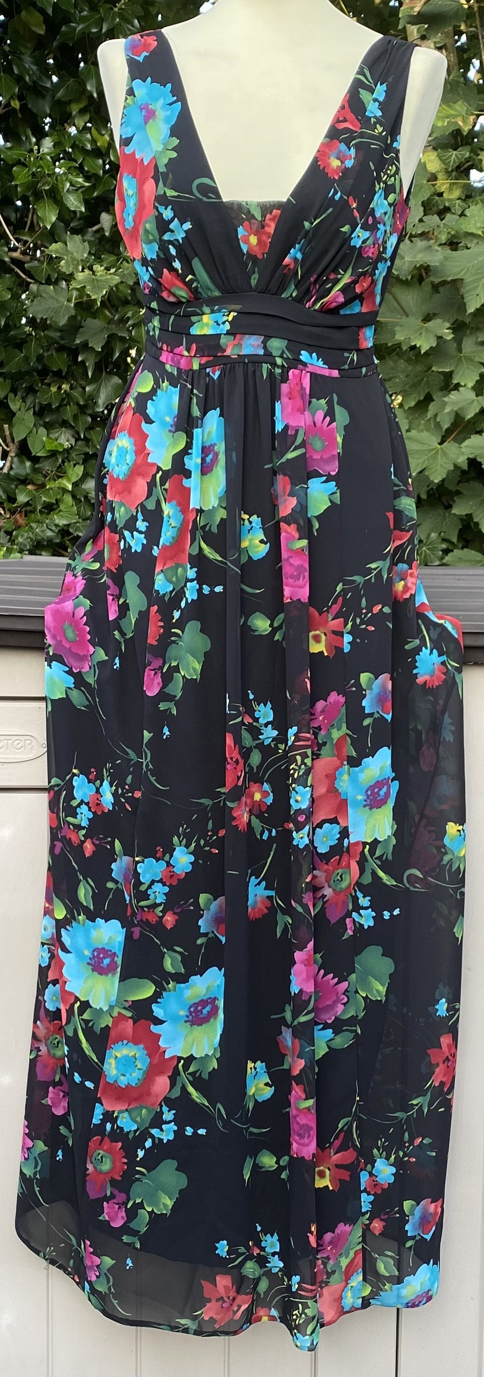 Wunderschönes, sommerliches Kleid in Empire-Linie mit farbenfrohem Blumenmuster auf schwarzem Grund. Das Kleid wurde nur einmal getragen und ist daher in neuwertigem Zustand.