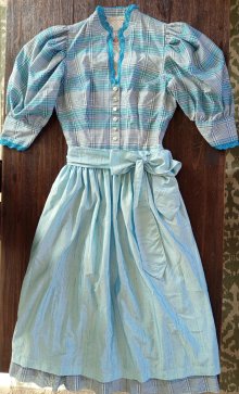 Im Brustbereich and am Rock ist der Stoff leicht verfärbt, was sich mit dem entsprechenden Fleckenmittel bestimmt beheben lässt. Ansonsten befindet es sich in einem sehr guten Zustand.
