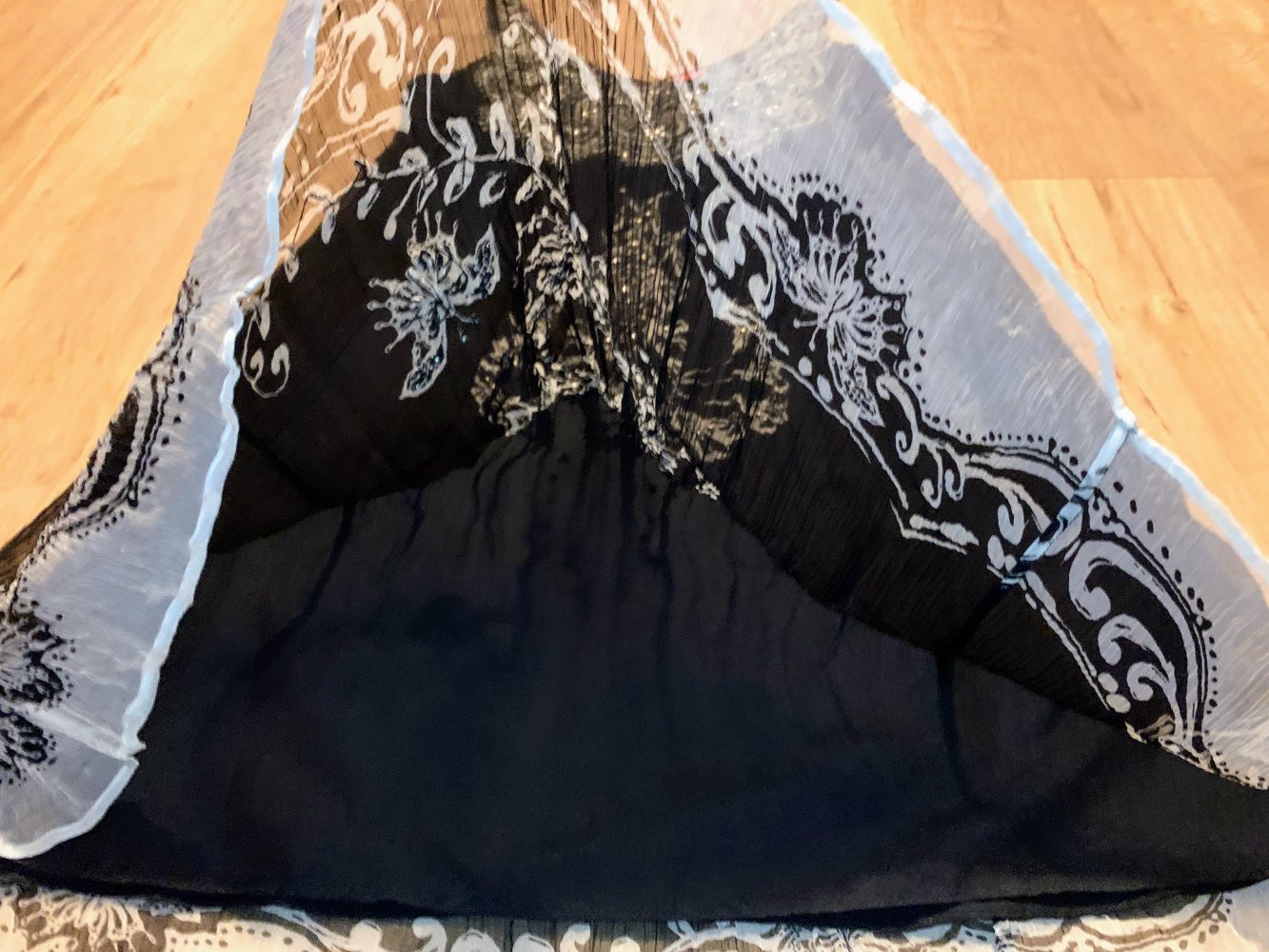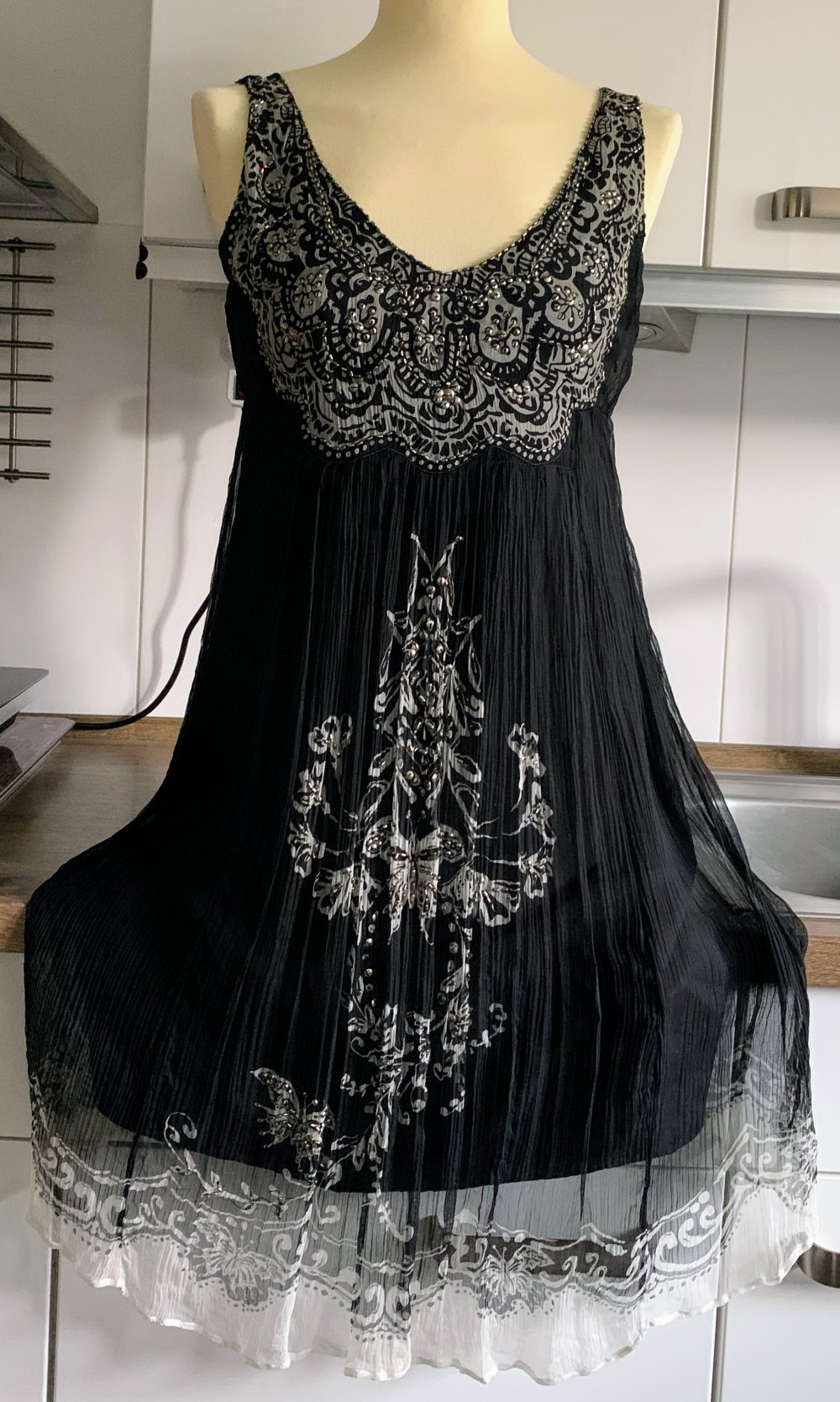 Elegantes, luftiges Sommerkleid aus der Derhy-Kollektion in fließender A-Linien-Form. Mit feinen Pailletten und Metallplättchen verziert, wirkt es modern und edel zugleich. Der transparente Crashstoff fällt sehr fein und leicht, das Kleid ist komplett gefüttert und hat einen seitlichen Reißverschluss.