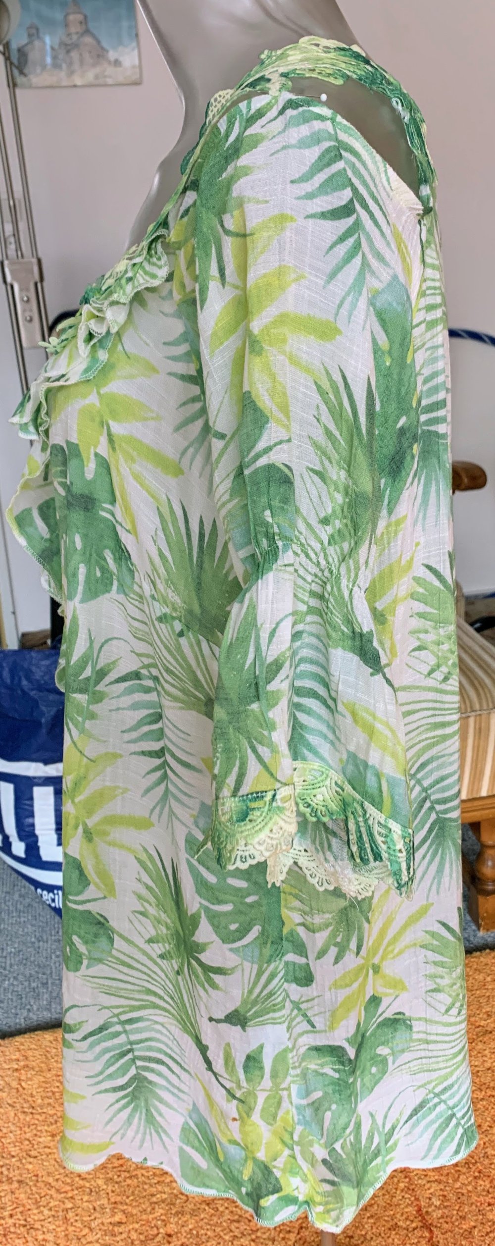 Zauberhafte Tunika im romantischen Spitzendesign von Laura Torelli. Der V-Ausschnitt ist mit feiner Spitze verziert, während die Rüschen und die lockere, figurumspielende Passform dem Kleid einen femininen und verspielten Look verleihen.