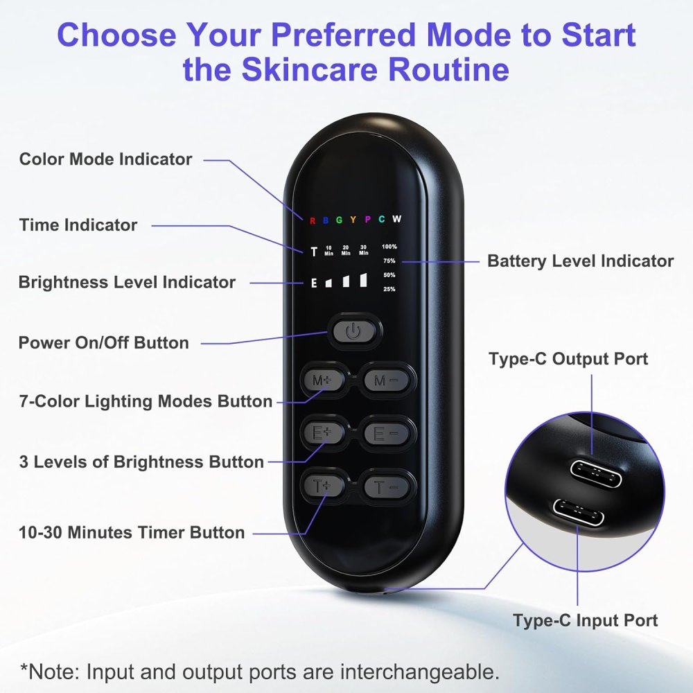 - Bietet sieben Farboptionen - Rot, Blau, Grün, Gelb, Lila, Cyan und Weiß. Sie verfügt über drei Helligkeitsstufen und einen 10-30-Minuten-Timer. Sie können Dauer und Intensität der flexibel an Ihren Hauttyp und Ihre Anwendungsgewohnheiten anpassen und so eine präzisere und effektivere Hautpflege erzielen