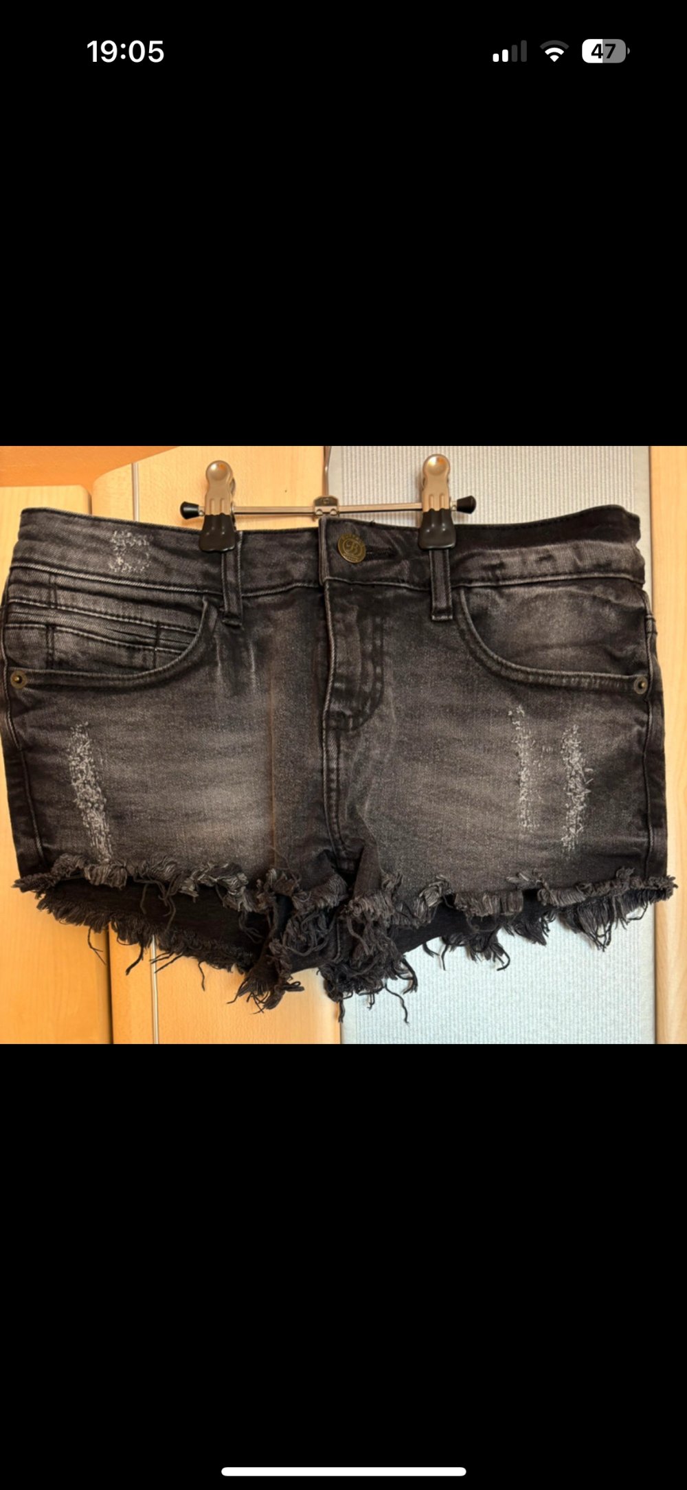 Ausgefallene, graue Jeans Shorts mit Ketten, Gr.S