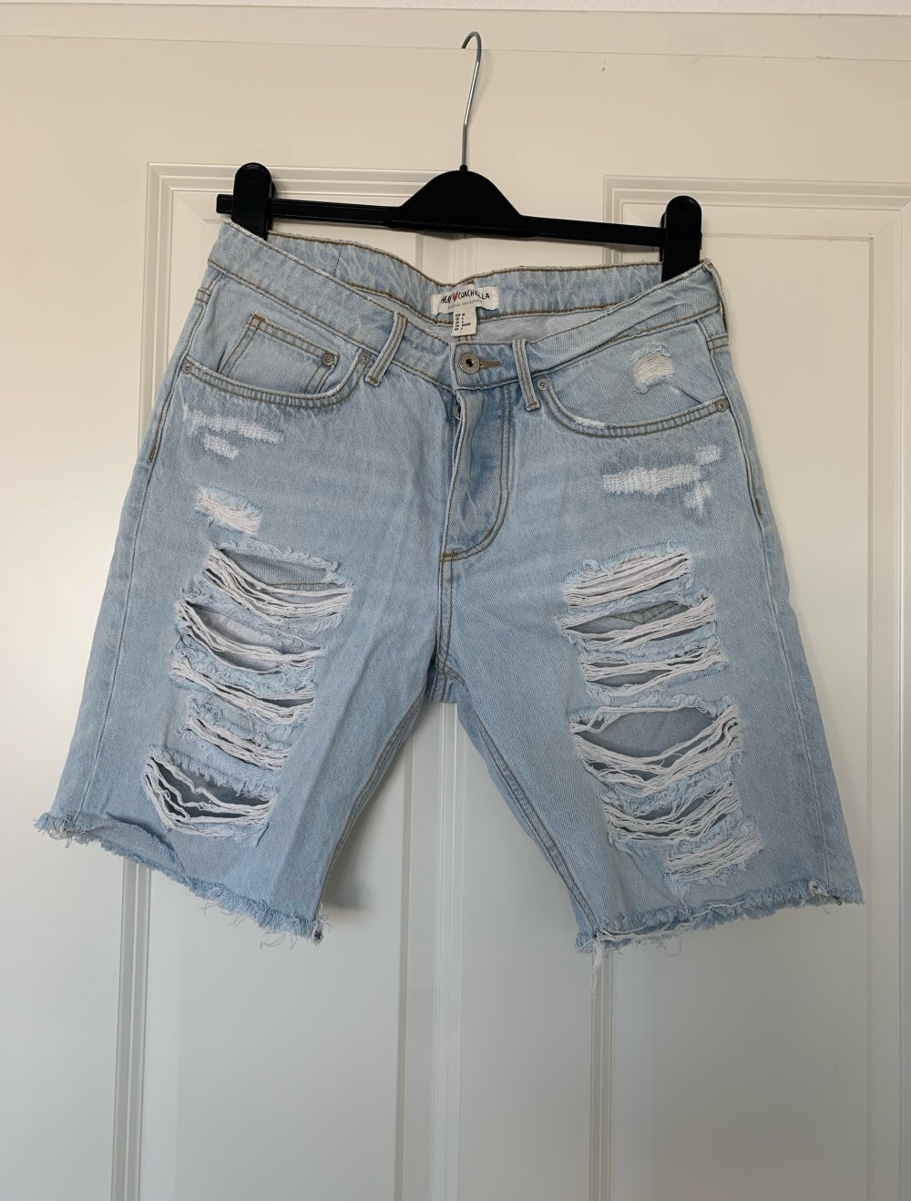 Bezaubern Sie in den hellblauen H&M Coachella Jeans Shorts im Bermuda-Stil, die sich perfekt für Freizeitaktivitäten , Reisen oder Partys eignen. Diese klassisch geschnittenen Shorts in Größe 36 bieten durch ihren Five-Pocket-Style praktische Taschen und sind aus reiner Baumwolle gefertigt, was sie besonders pflegeleicht macht.