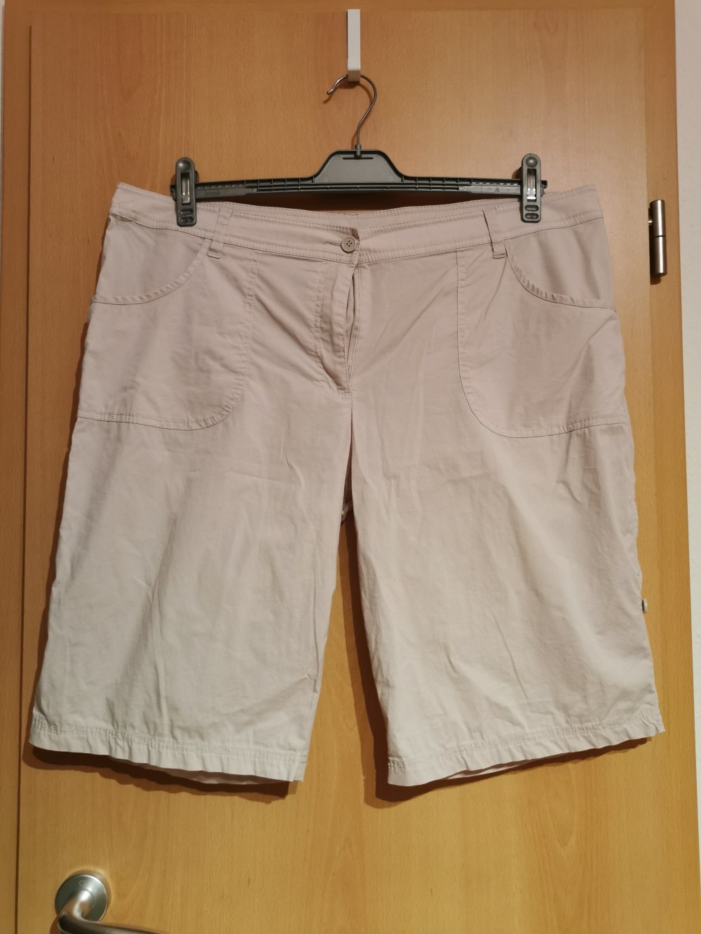 Ich biete diese Bermudahose an. Sie ist cremebeige, hat die Größe 48 und ist von Bonprix. Die Hose hat zwei Eingriffs- und zwei Gesäßtaschen. Sehr minimales Pilling ist im Schritt. Vorne links, links an der Naht und hinten auf beiden Seiten sind leichte dunkle oder rötliche Flecken (siehe Bilder). Sonst ist die Hose in einem sehr gutem Zustand.
