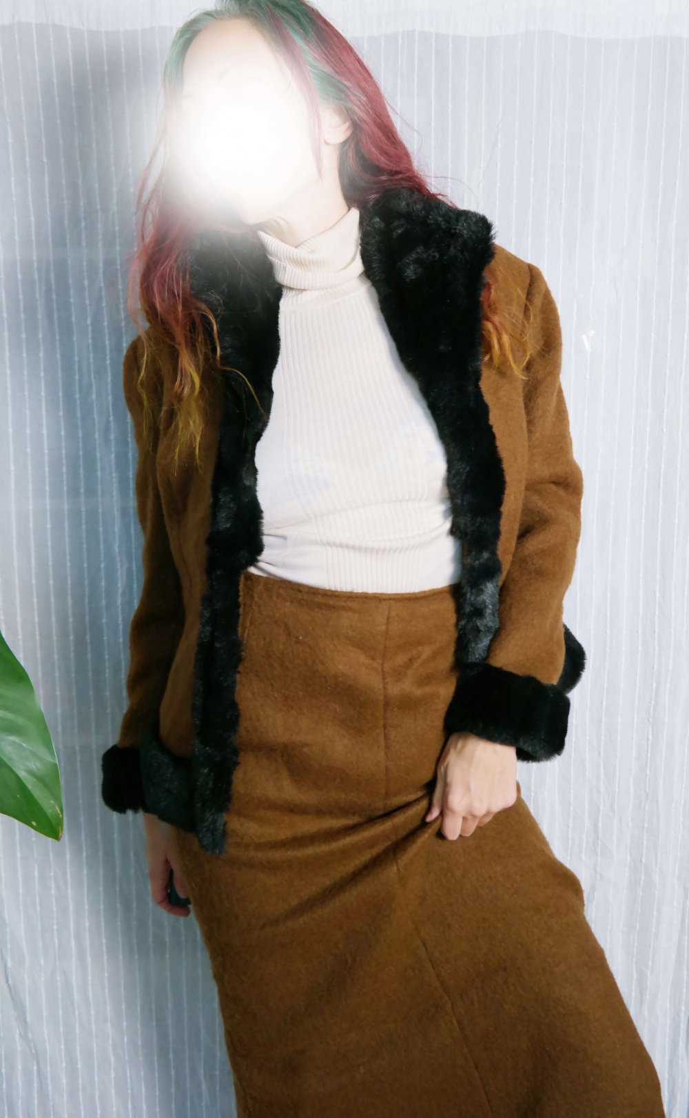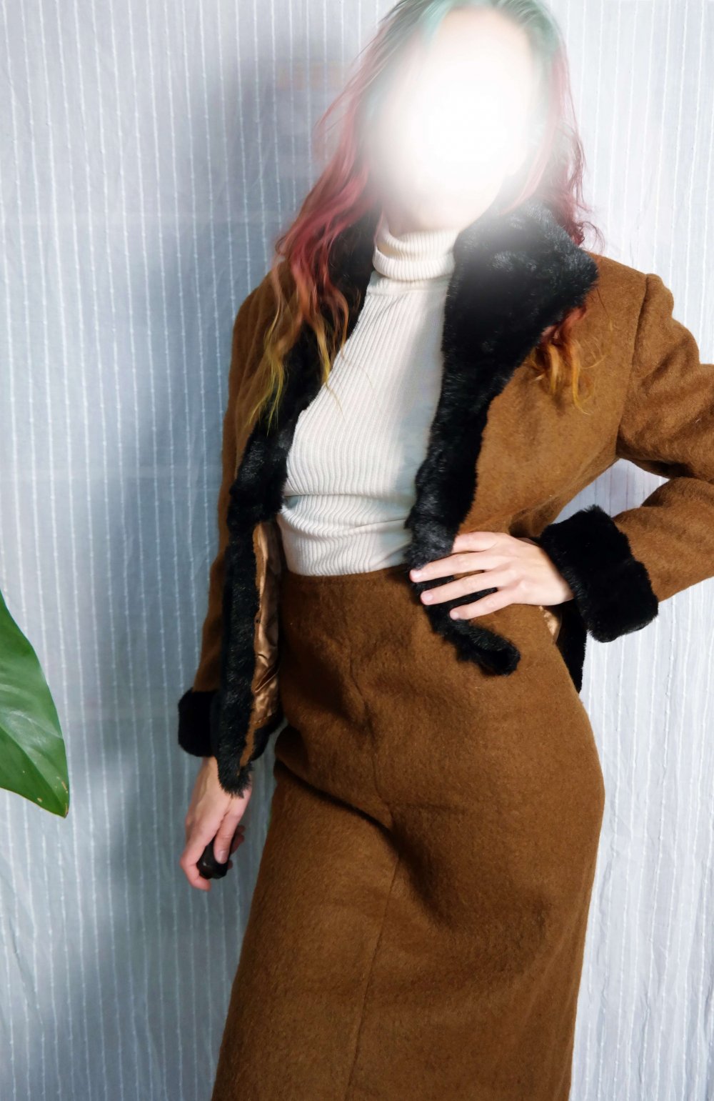 Einzelstück handmade Twinset Wolle Wolljacke Wollblazer Wollrock Blazer Rock edel elegant dunkelbraun schwarz Teddypelz Pelzkragen M 38