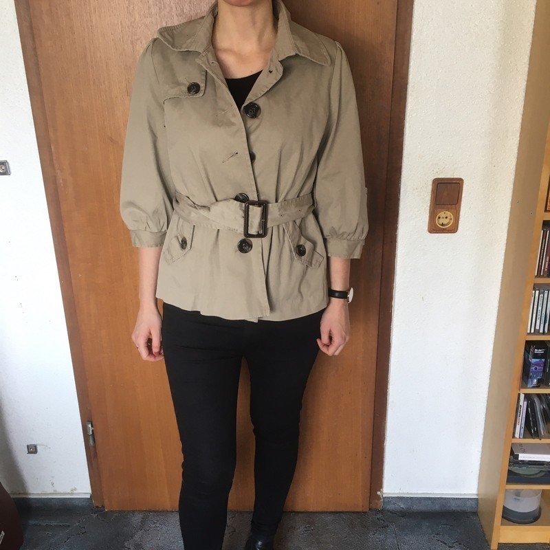 Schöne beige Jacke für den Frühling mit einer Länge von ca. 65 cm zu verkaufen. Material: Obermaterial: 100% Baumwolle, Innenfutter:100% Baumwolle und Ärmelfutter: 100% Polyester.