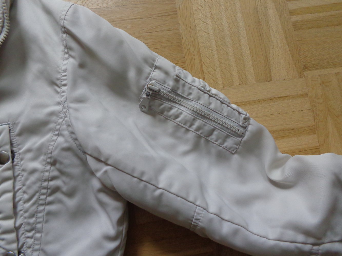 sehr gern getragene Jacke, Gr. M bzw. ca. Gr. 38, H&M, RV, weißgrau, Kapuze (nicht abnehmbar), Steppfutter (hält schön warm), vorn 2 seitliche Brusttaschen mit Druckknöpfen, warmes Innenfutter und 2 Eingrifftaschen mit Druckknöpfen, warmes Innenfutter, Obermaterial 100 % Polyamid, Futter und Wattierung 100 % Polyester, 1 Innentasche mit RV, Länge ca. 71 cm, von Achsel zu Achsel ca. 53 cm, Unterarmlänge ca. 45 cm, übliche normale Trage-Abnutzung, Strickbündchen am Saum und Ärmeln, 17,00 Euro, Versand ca. 5,50 Euro möglich, zeitnahe Antwort, rauch- und tierfreier Haushalt, Privatverkauf, Rücknahme ausgeschlossen (3987 - 3995, nur für mich)