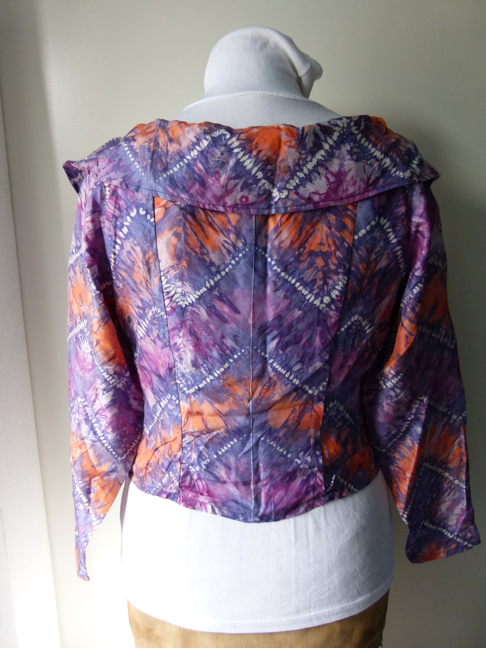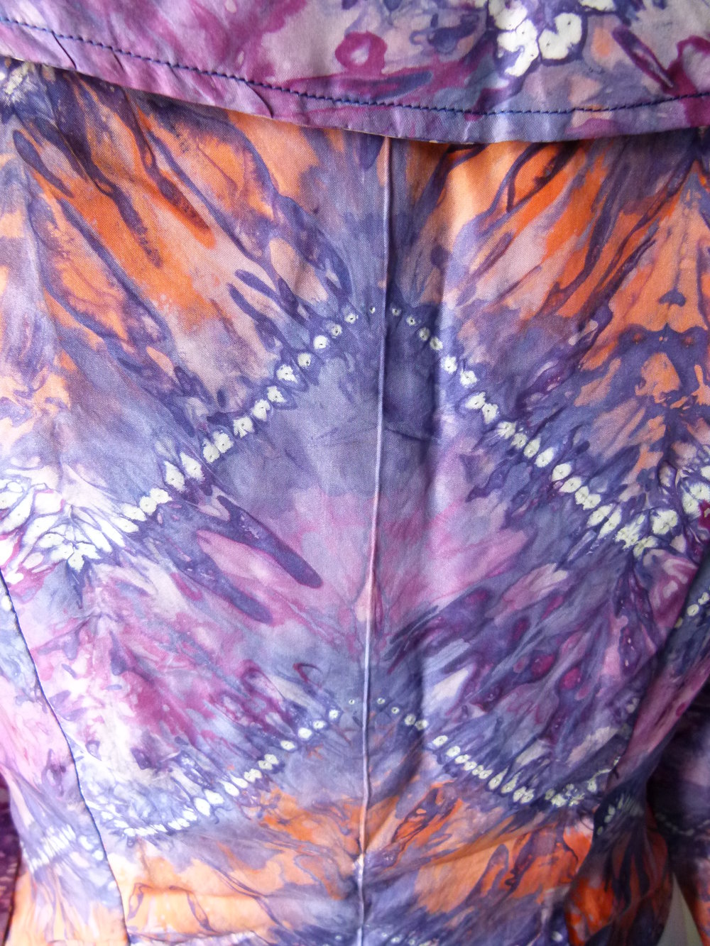 Außergewöhnliche Seiden-Bluse mit wunderschönem Batik-Muster in orange, violett, lila und weiß.