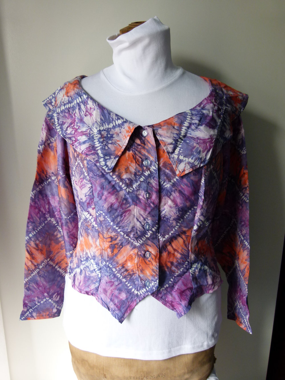 Tye Dye Seiden Bluse, lila orange weiß Batik, Sommer Goa Hippie Boho Festival