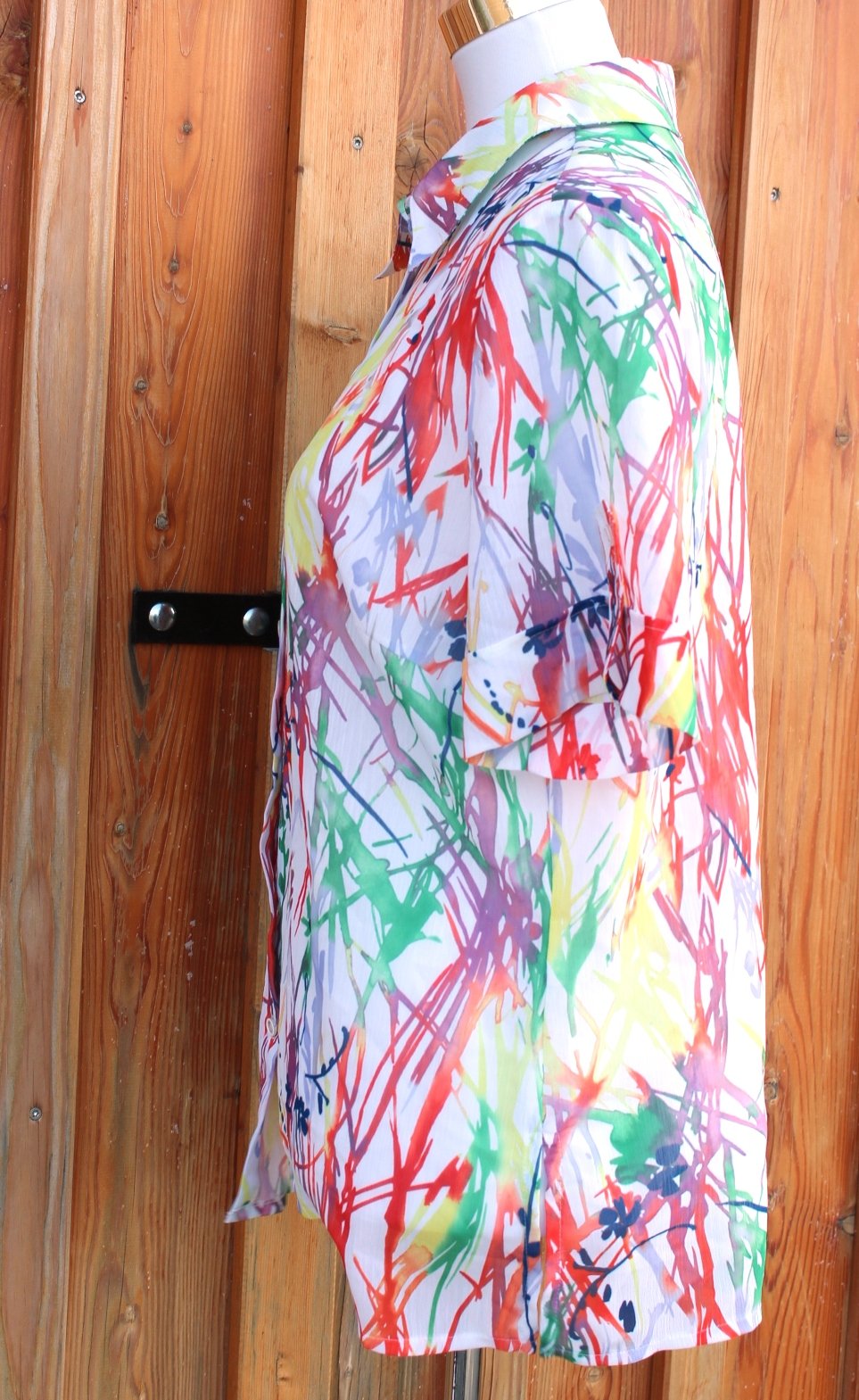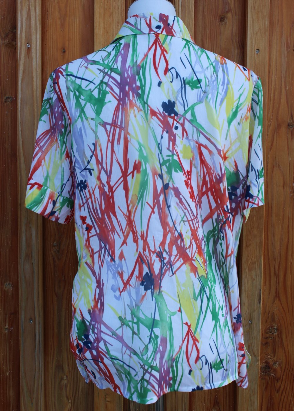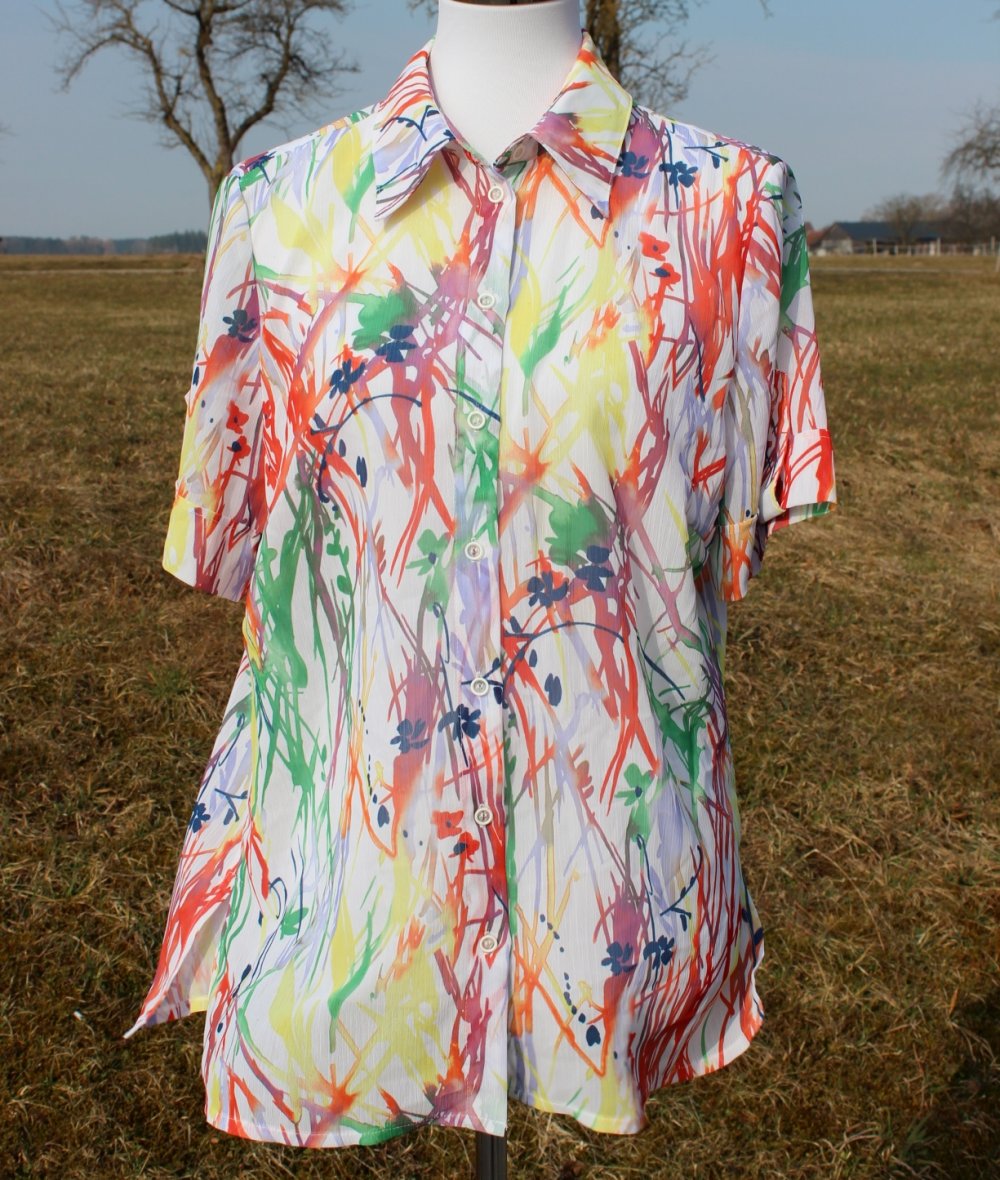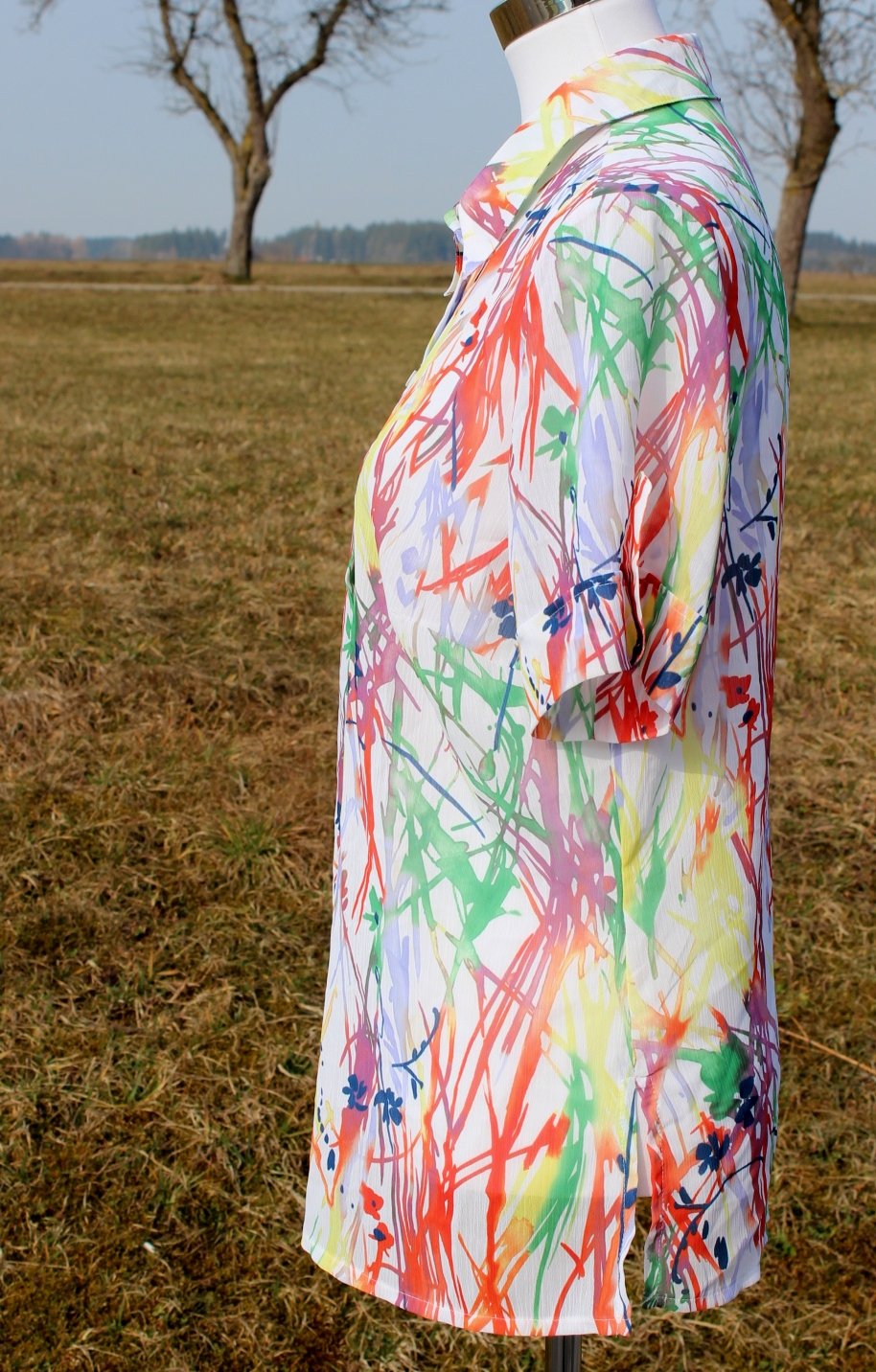 *) Die fröhliche Sommerbluse ist weiß und hat ein buntes Muster aus Streifen, Pinselstrichen und abstrakten Blumen in gelb, orange, rot, blau, grün… also: bunt.