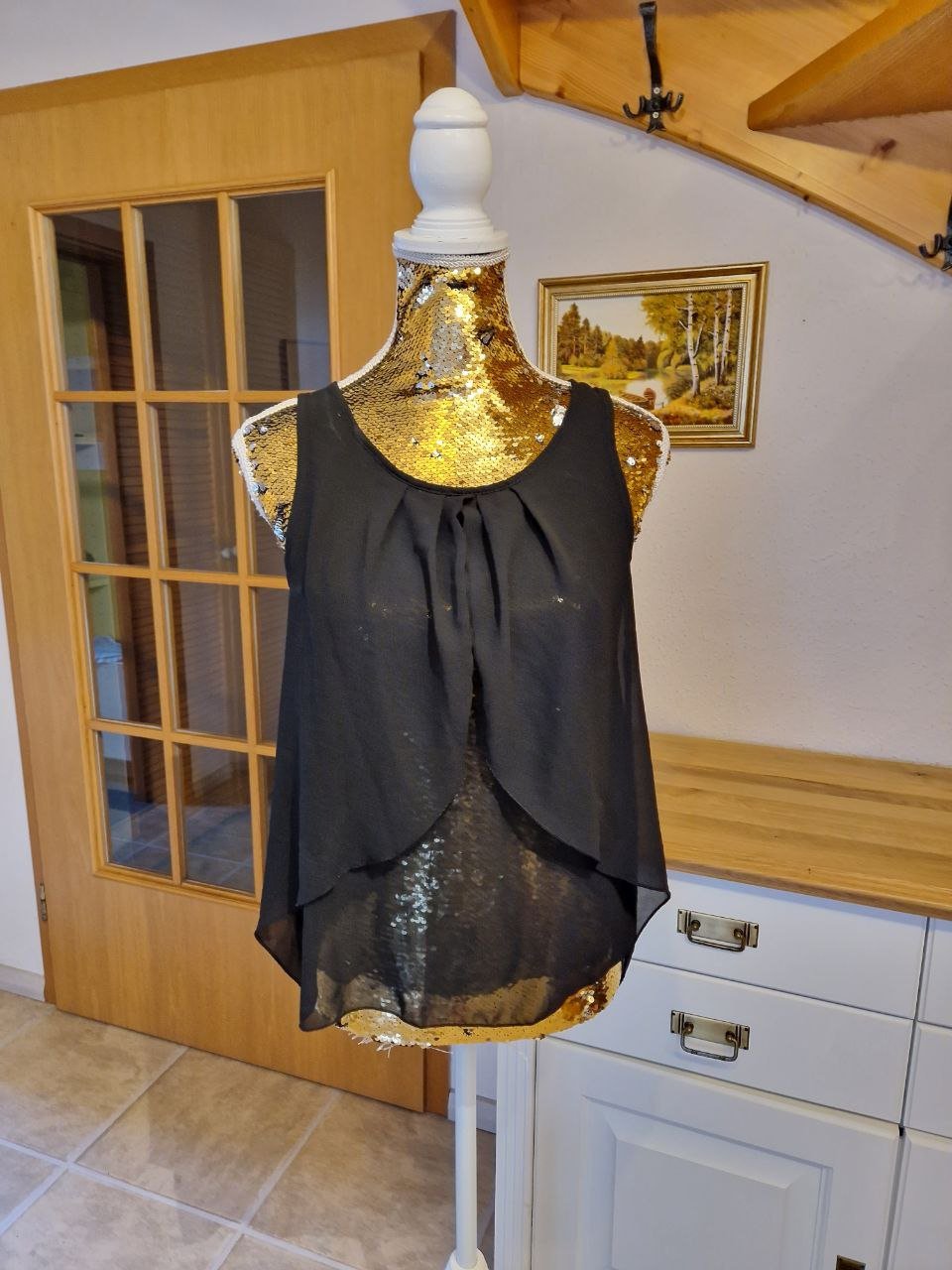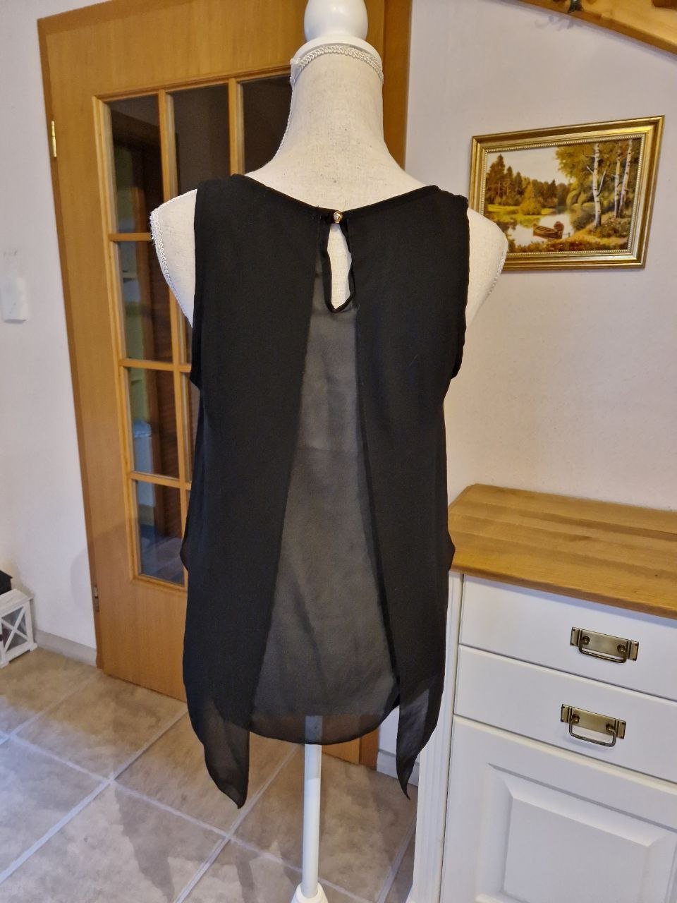 #Vintage Bluse ärmellos, lange Form, Gr. 36/38 bzw. ca. Gr. S/M, schwarz/weiß