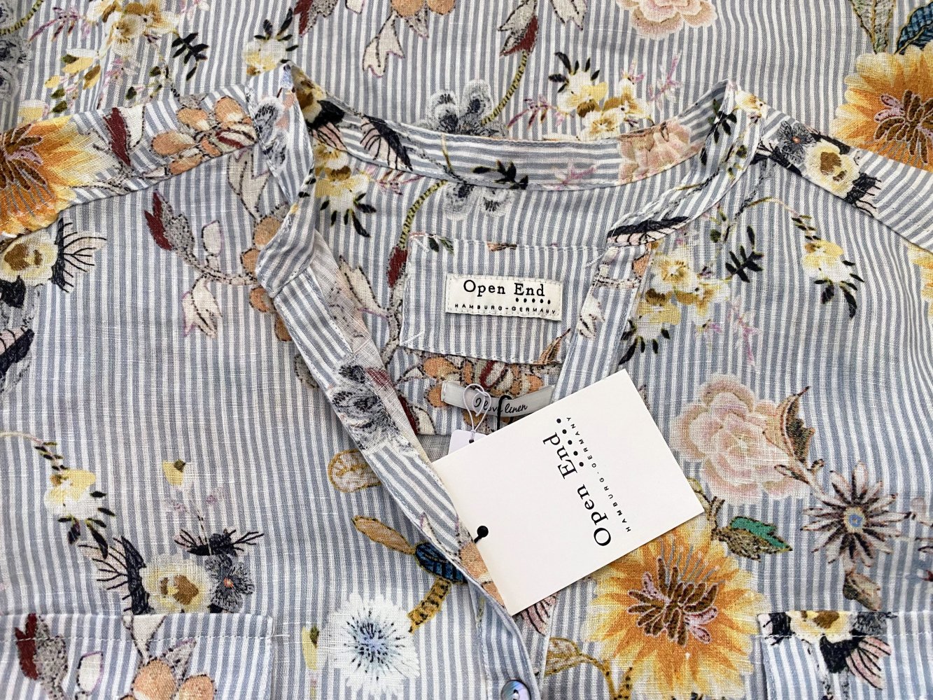 Edle Leinenbluse von Open End mit klassischem Schnitt und modischem Blumen-/Streifendessin.