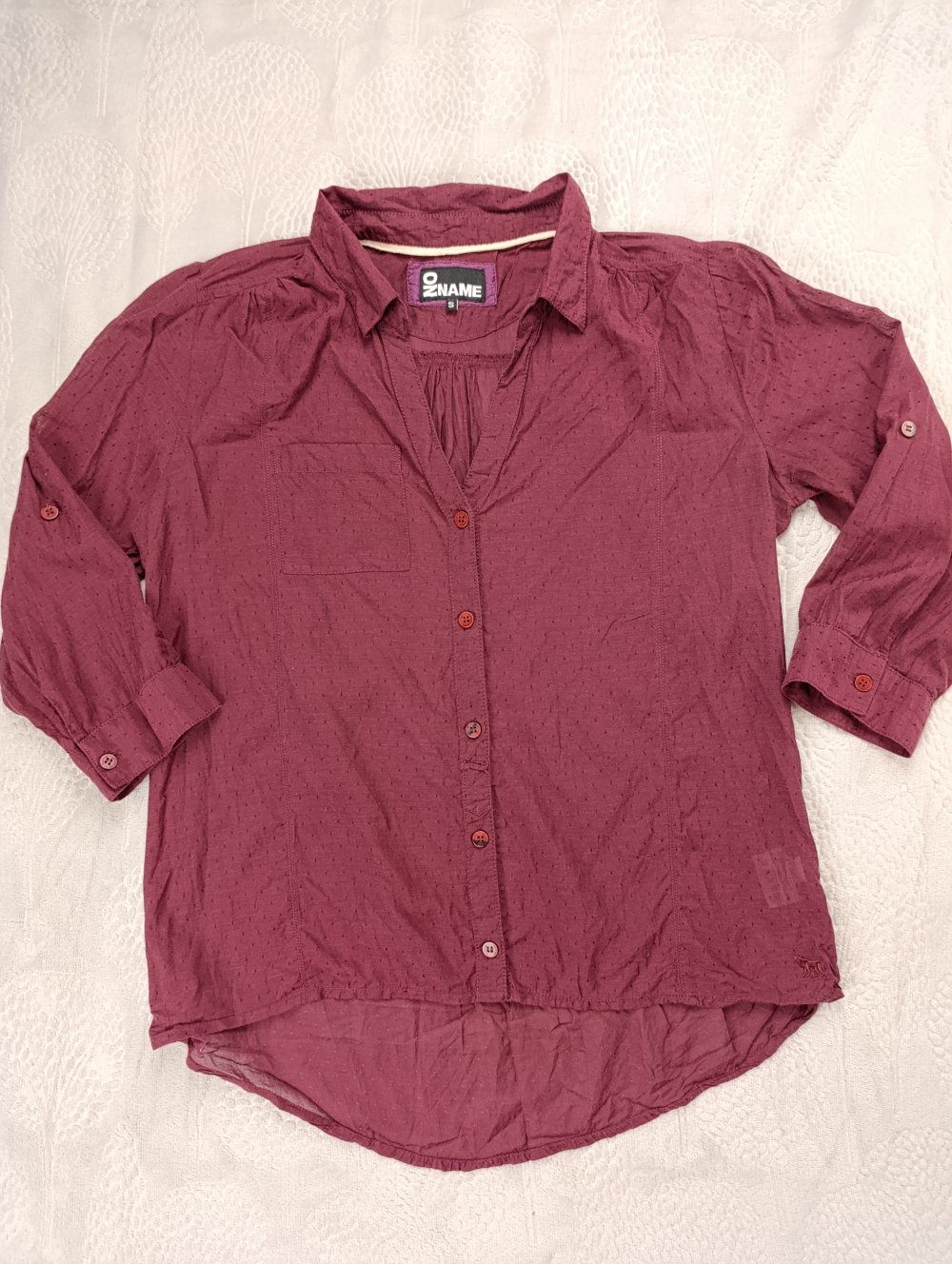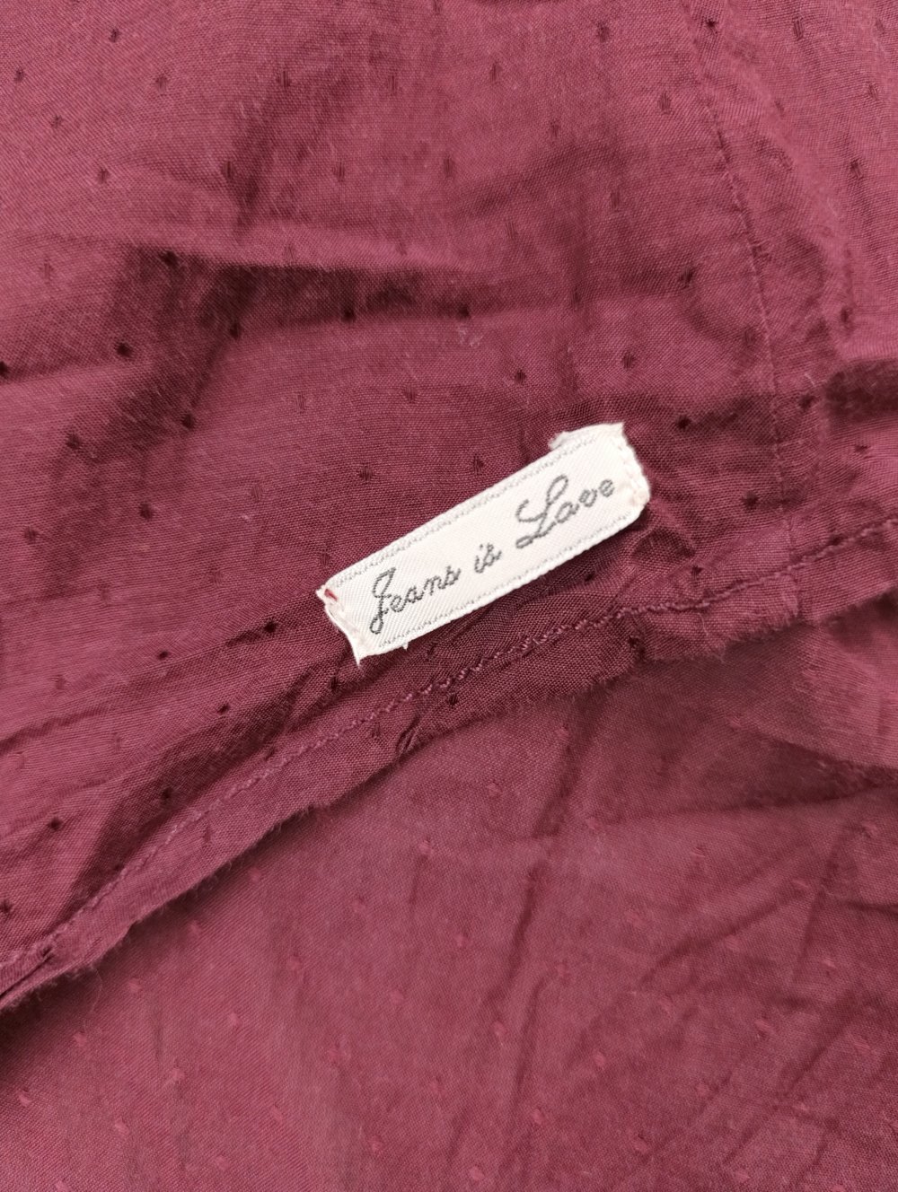 Wunderschöne, leicht taillierte Damenbluse in einem tiefen Bordeaux. Die Bluse ist aus einem leichten, strukturierten Stoff gefertigt, der durch dezente, kleine Punkte oder Noppen veredelt wird.