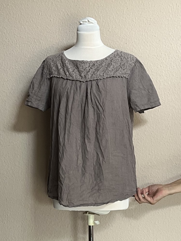 Made in Italy Leinen Top Gr.XXL mit Spitzenbesatz Farbe Taupe, Kurzarm Bluse aus festem Leinen mit kleinem Cut Out am Rücken. Shirt ist mit einer Gr. XXXL ausgezeichnet entspricht aber einer Gr.44