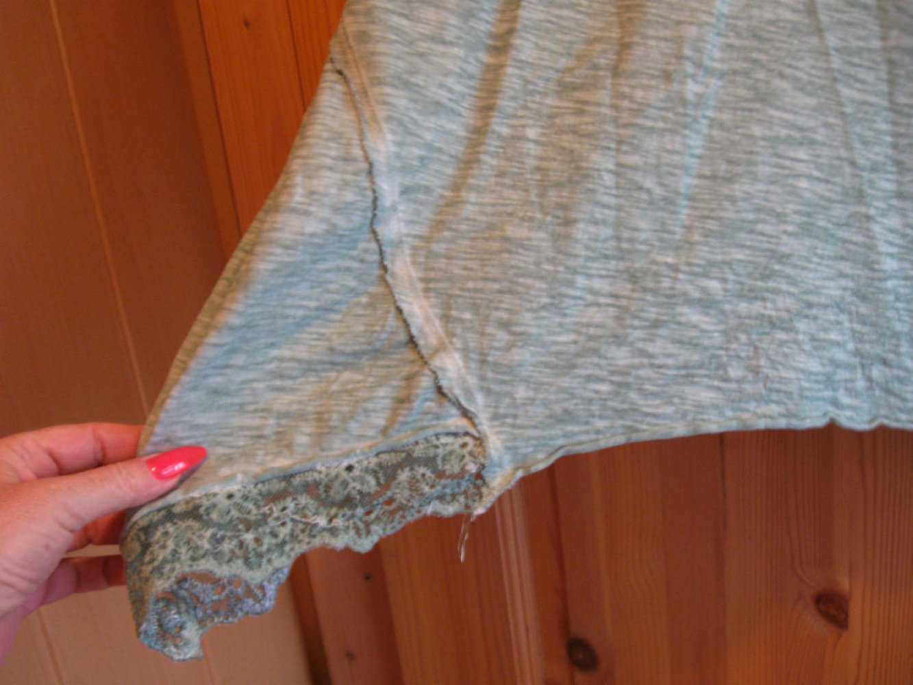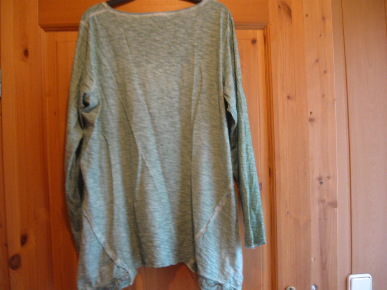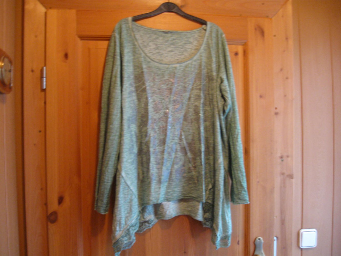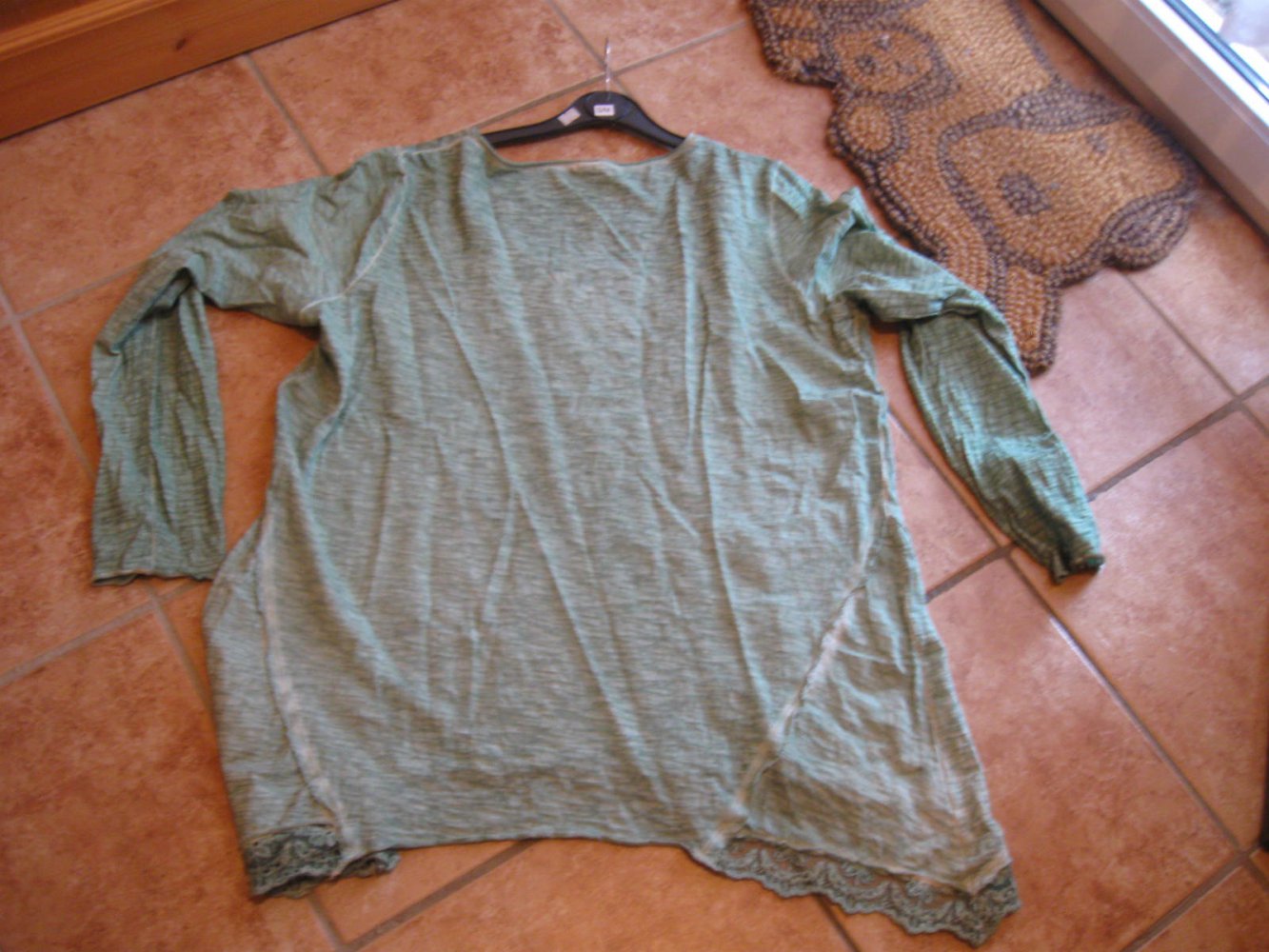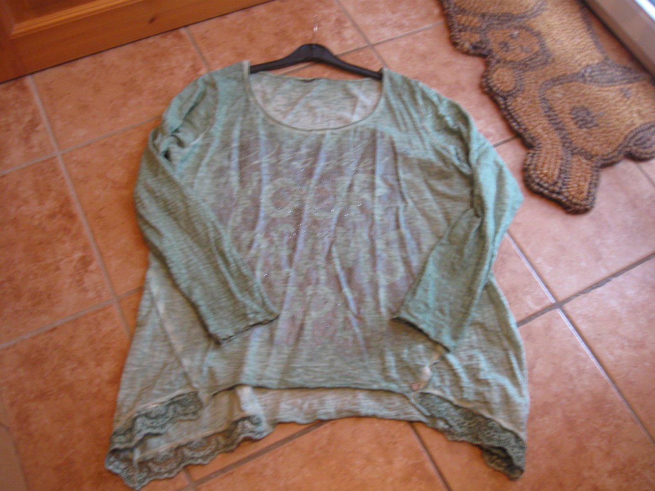 Biete dieses Shirt, das an den Seiten länger geschnitten und diese mit Spitze besetzt ist. Der Brustbereich ist mit kleinen Steinchen verziert. Die Größenangabe fehlt, bitte die Maßangaben beachten. Die angegebene Größe habe ich geschätzt.