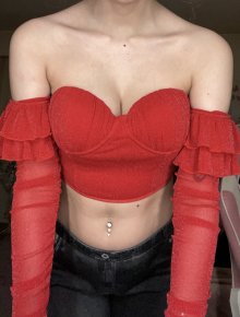 #oberteil #bauchfrei #bluse #oberteilmitrüschen #rüschen #glitzer #rot #langärmelig #elegant #sexy #kleidung #mode #frauen #damen #frauenmode #damenmode #fashion #fashionstyle