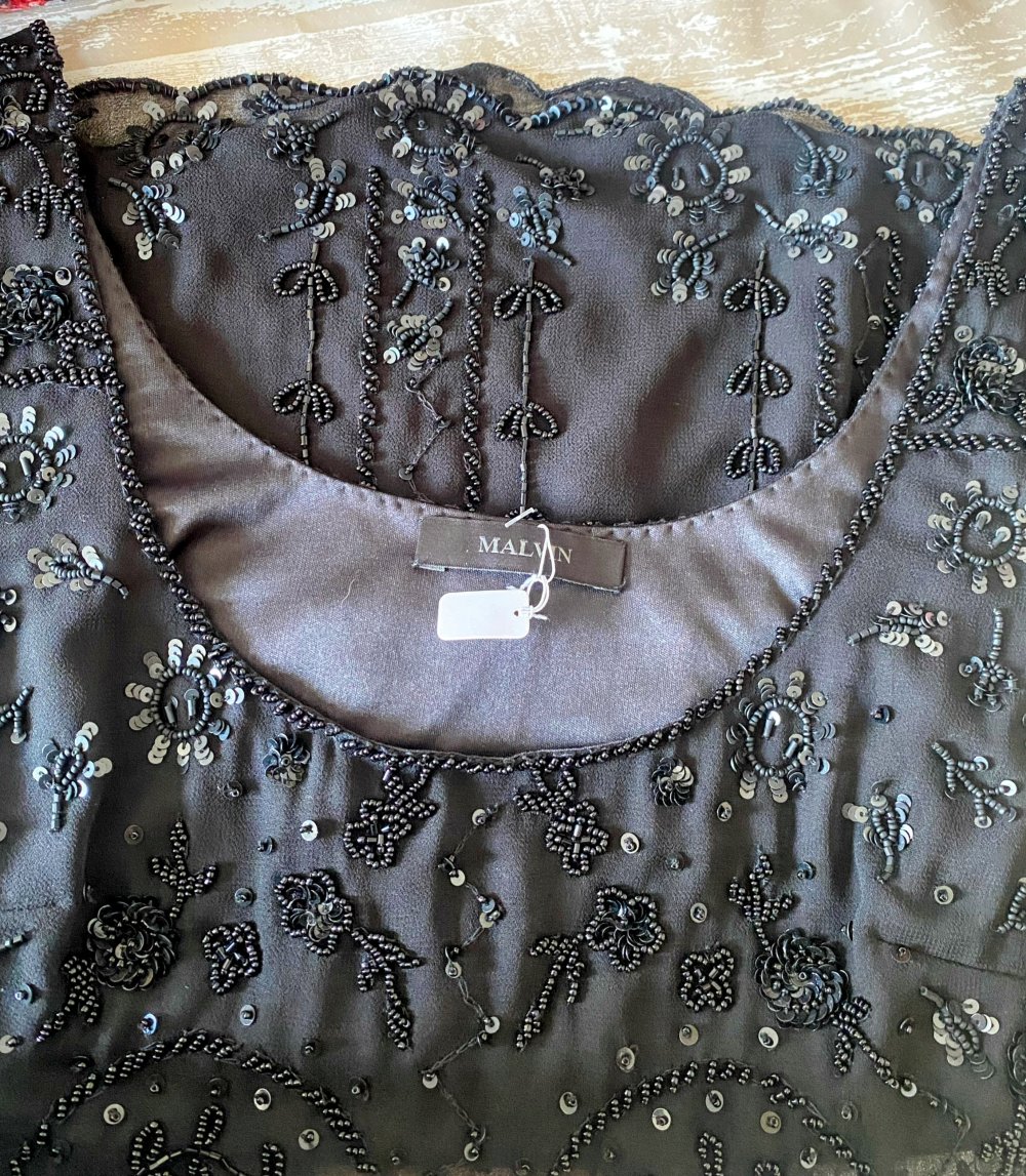 Edles, tailliertes Abendtop von Malvin aus luxuriöser Seide, verziert mit funkelnden Perlen und Pailletten. Der schimmernde Glitzer-Effekt macht dieses Stück zu einem echten Blickfang für besondere Anlässe.