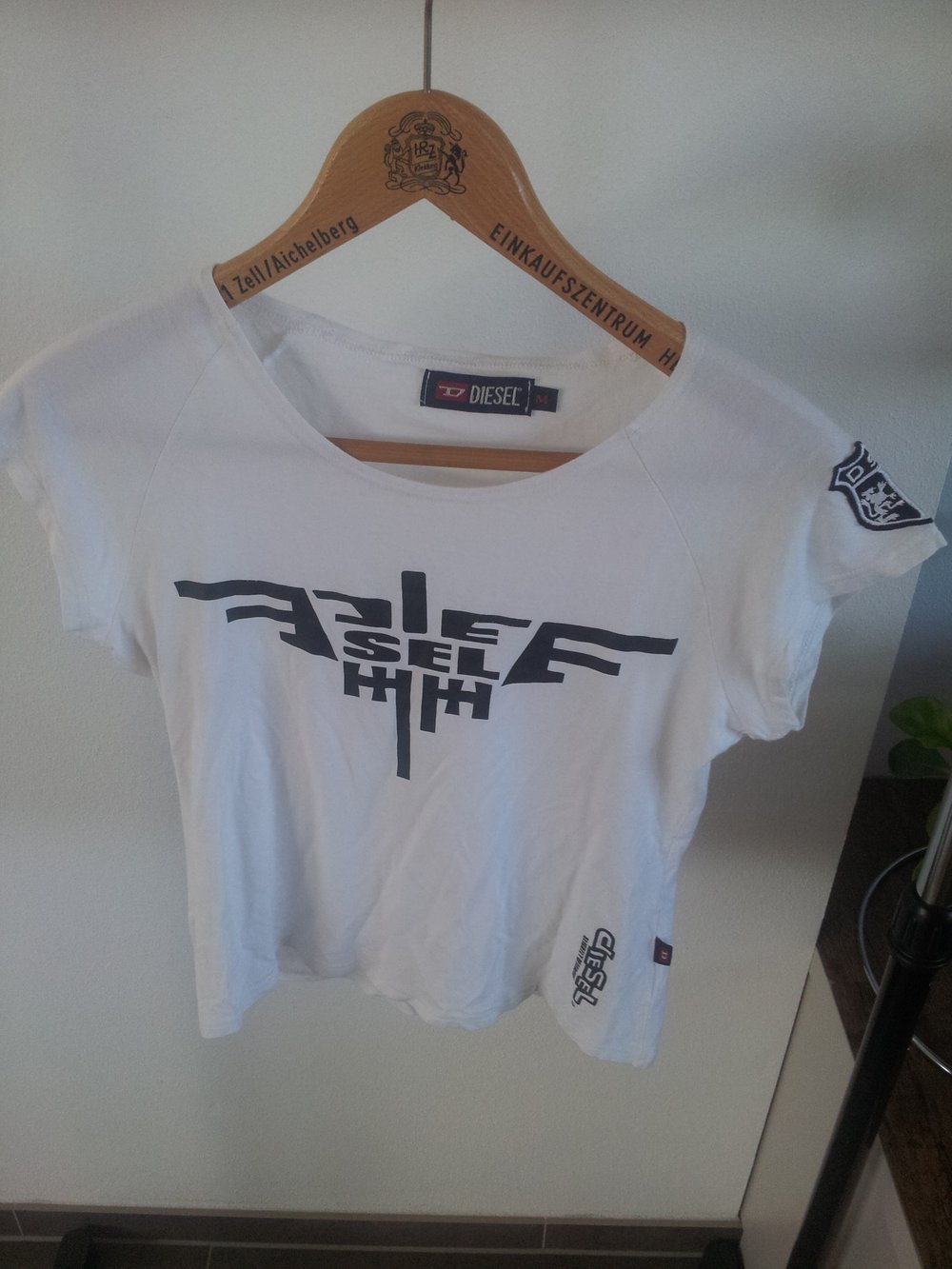 Cooles Diesel T-shirt super gerne getragen es ist etwas kürzer geschnitten so das man etwas haut sehen kann hat normale Gebrauchs spuren der Diesel auf druck hat leichte Risse bekommen