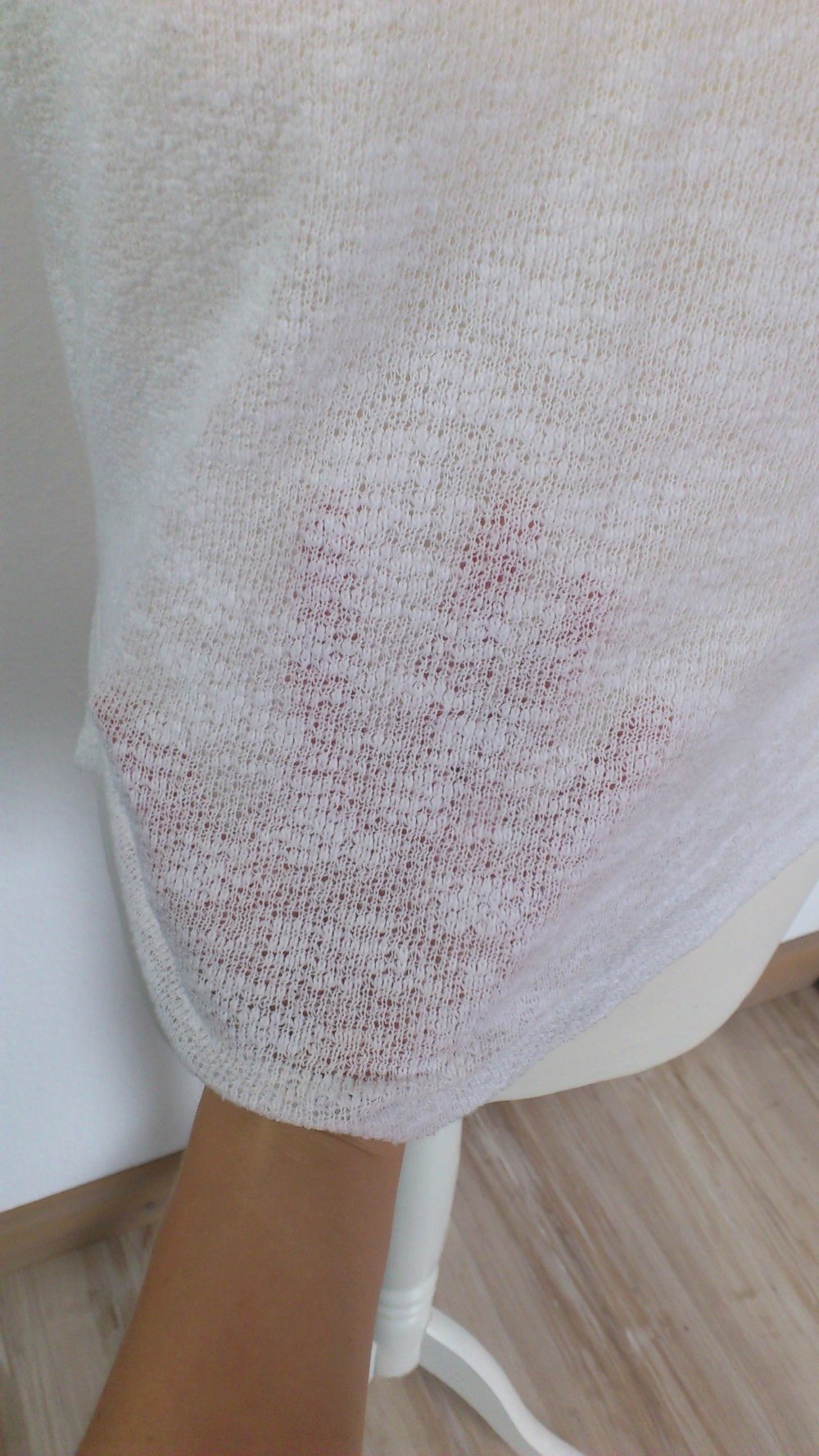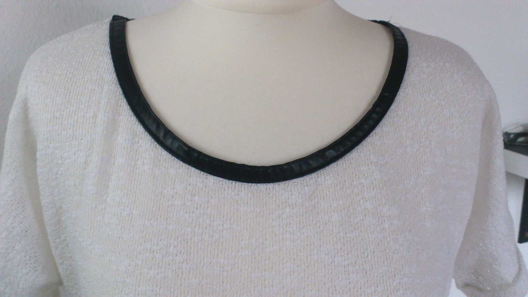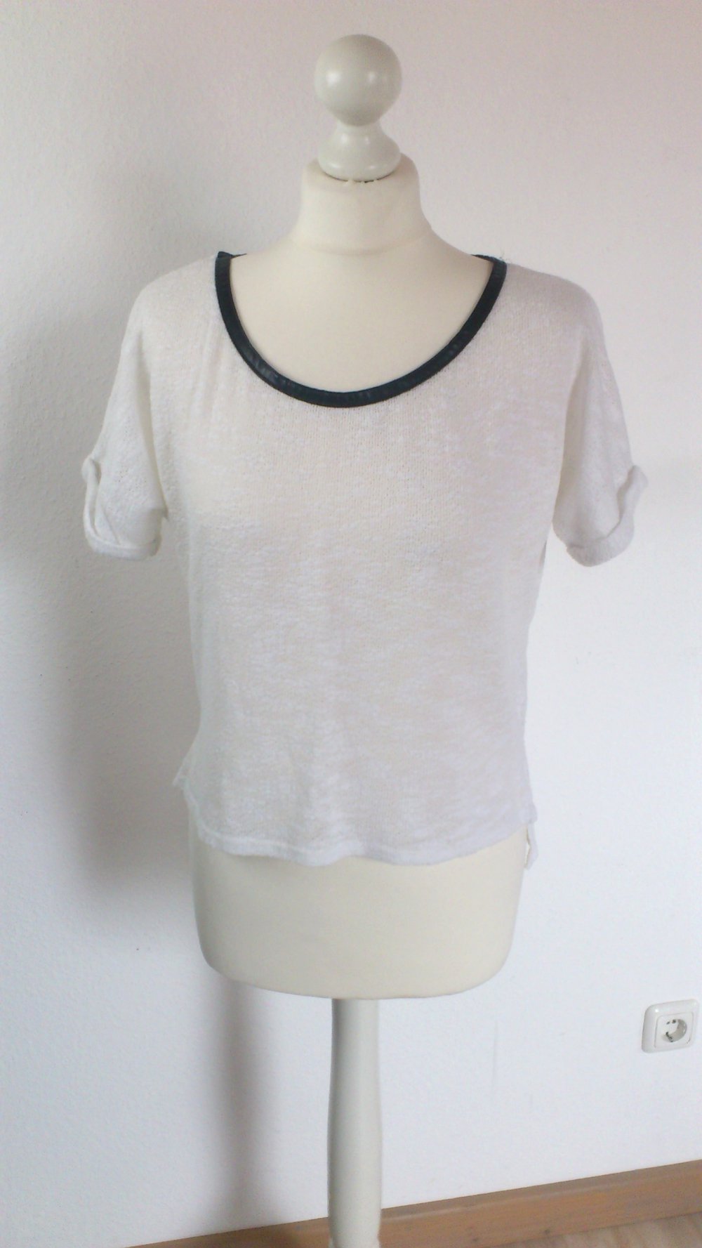 Schönes Oversize-T-Shirt mit schwarzem Kunstleder-Kragen. Hinten ist es etwas länger wie vorne und an den Seiten sind "Schlitze". Der Stoff ist leicht transparent. Die Ärmel sind umgekrempelt und angenäht, sodass sie in ihrer Form bleiben. Leider ist kein Größen-Etikett vorhanden. Es passt aber einer XS-S.