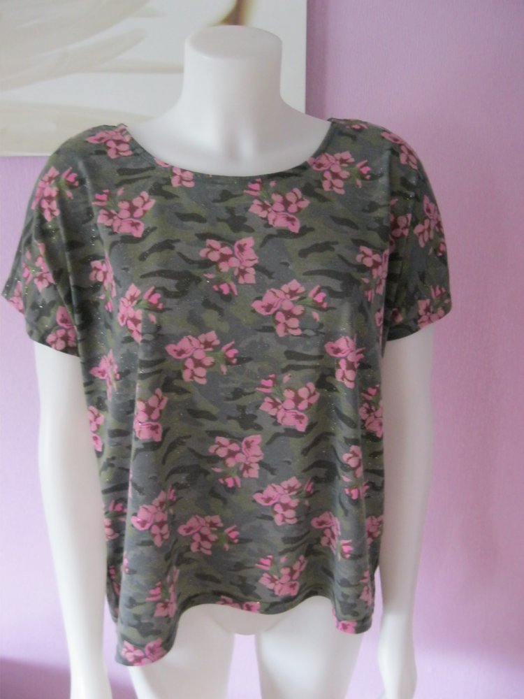 T-Shirt in floralem Muster. Grün-Töne, Blumen rosa und Goldglitzer.
